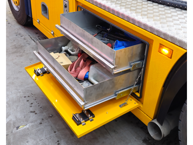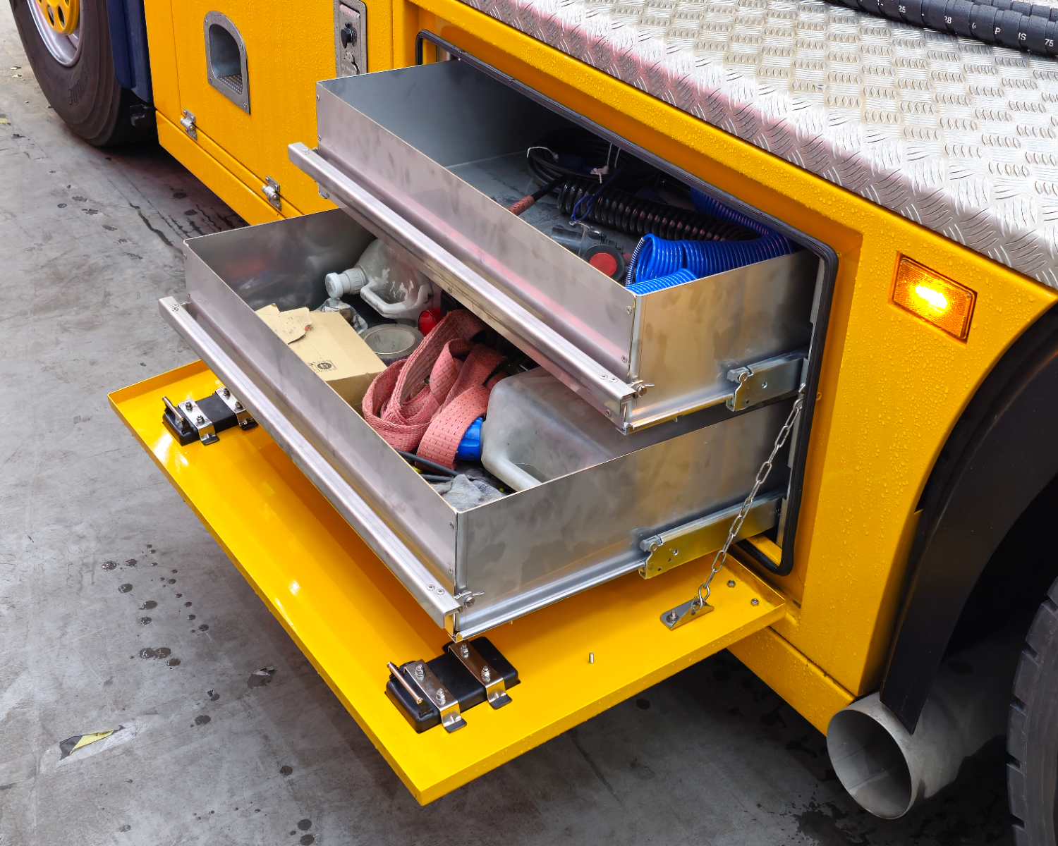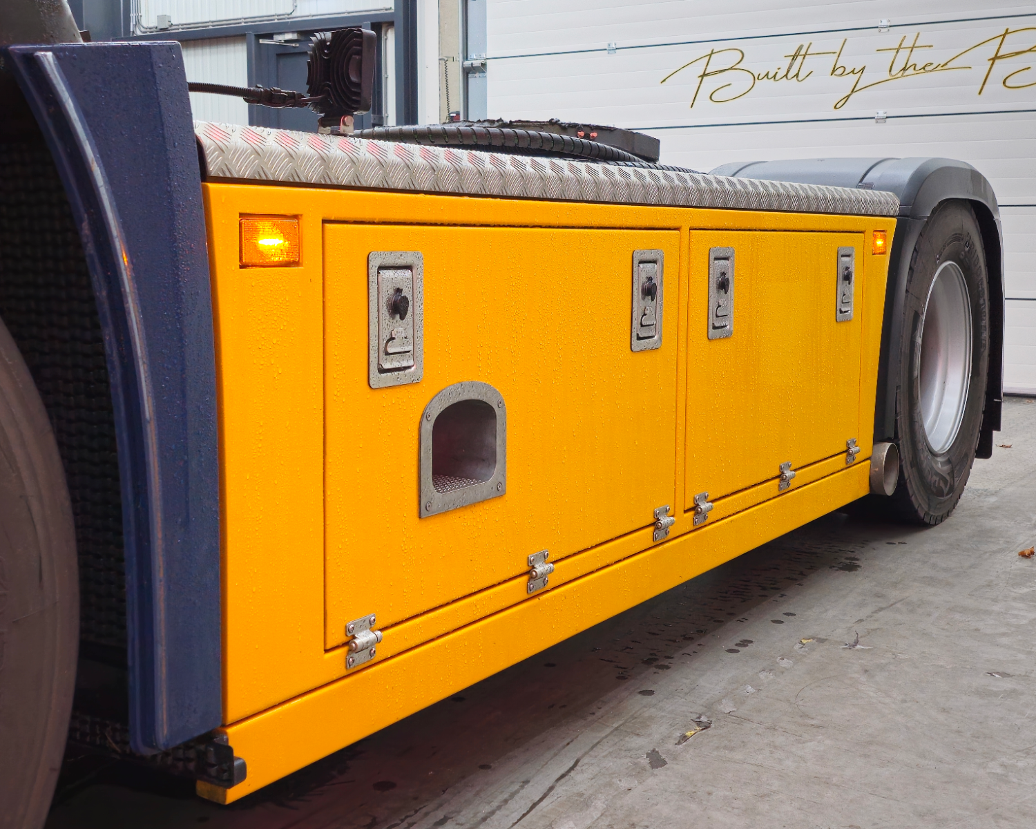 Links een kist met 1 nep deur en 2 lades achter de achterste deur, ook lampjes in de hoeken en verlenging tot de spatborden