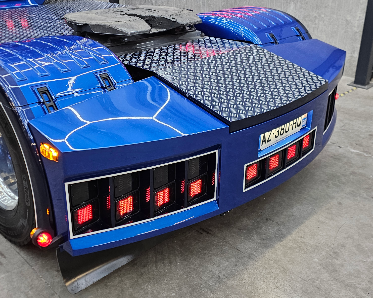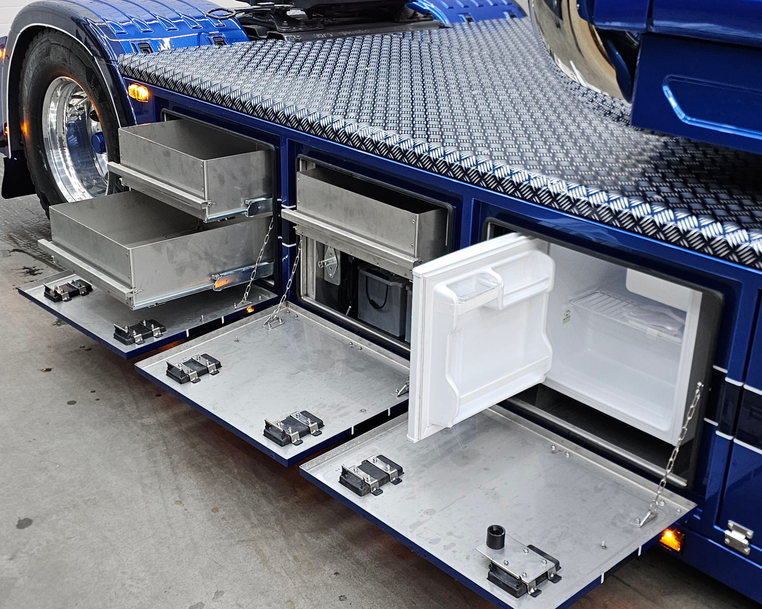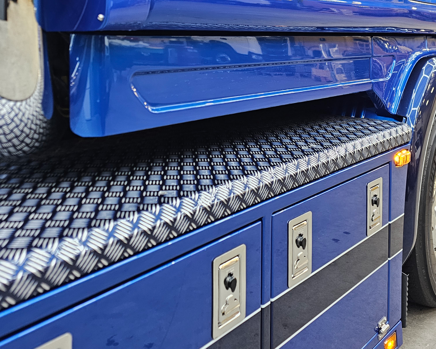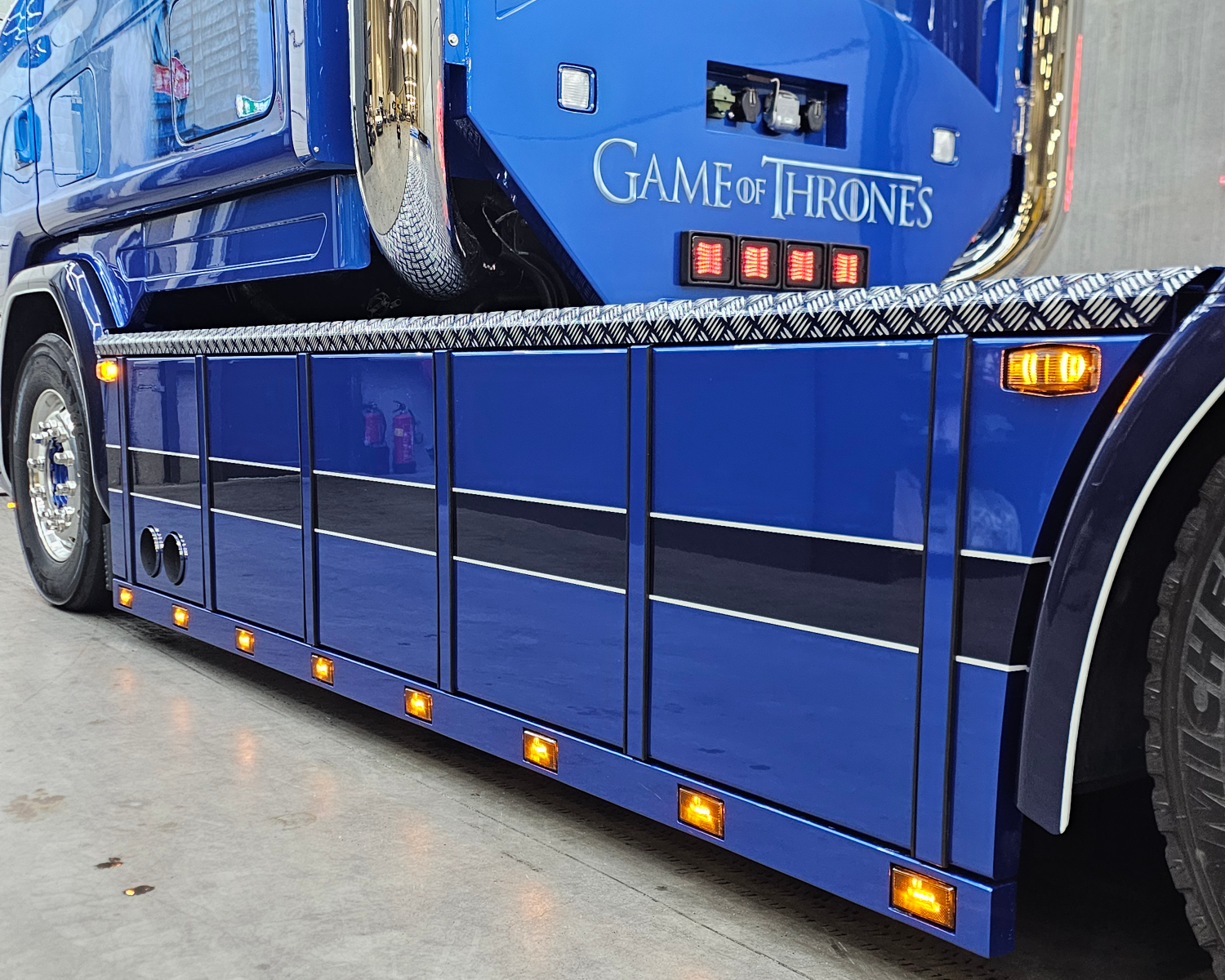 Latten onder de sideskirt en kist met originele Scania lampjes