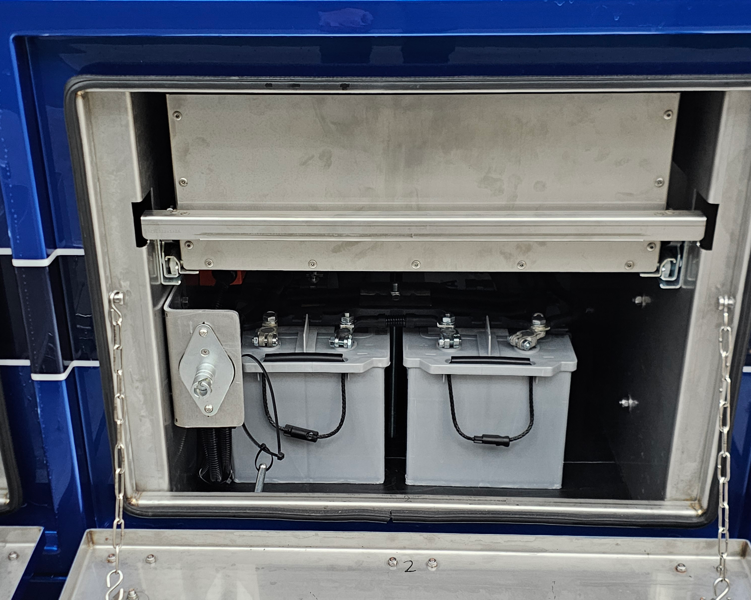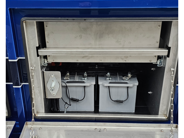 Kist rechts, 4 deuren, 3 deuren functioneel, met 3 lades, extra accus en een koelkast met omvormer