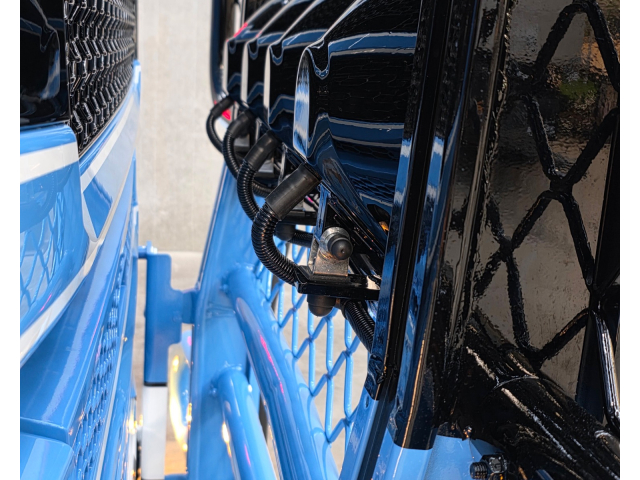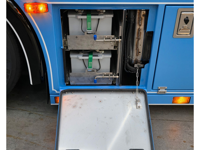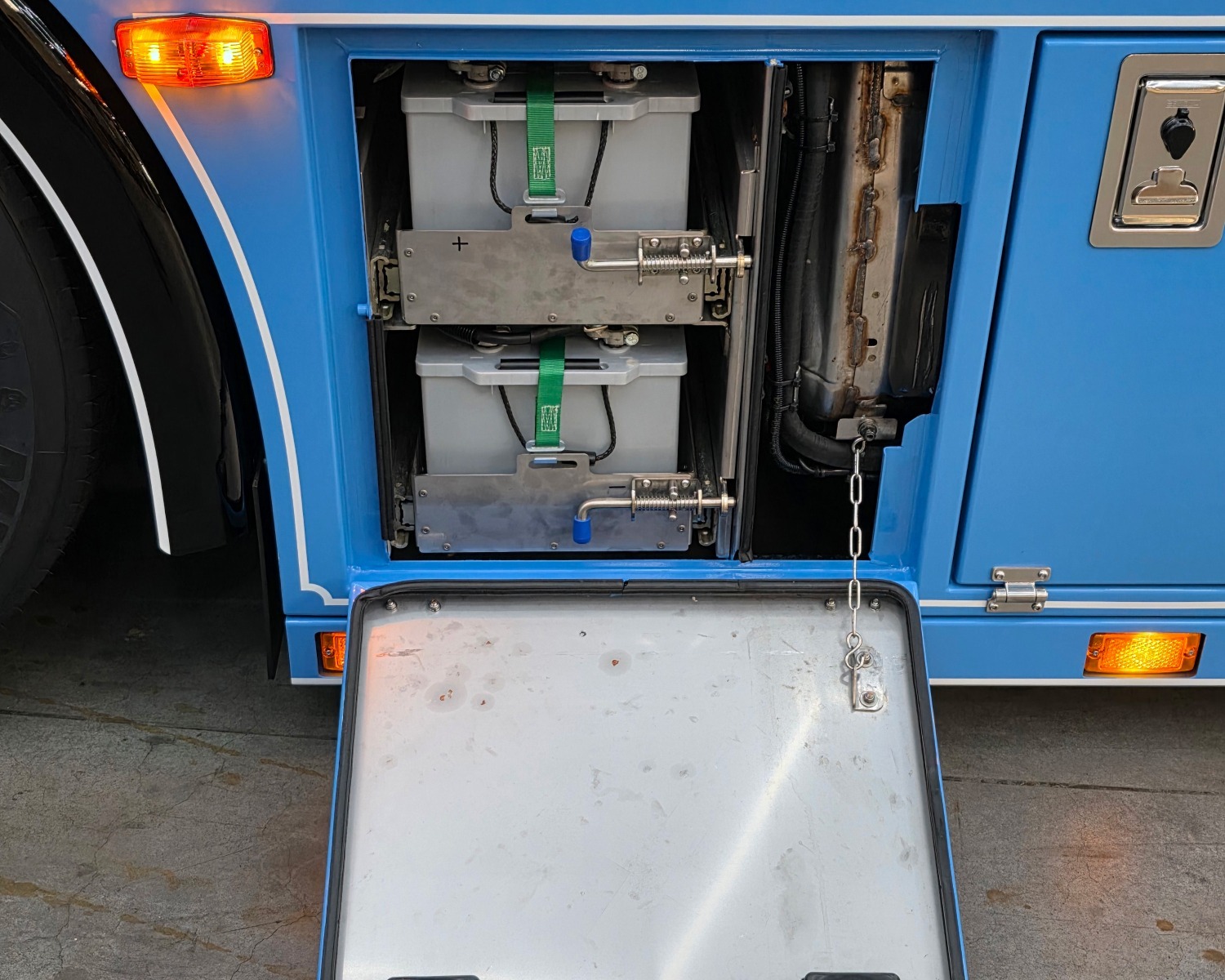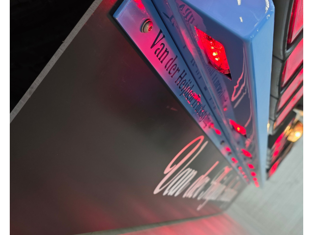 Rechts een kist met de accu's erin gemonteerd en dubbelbranders in de hoeken