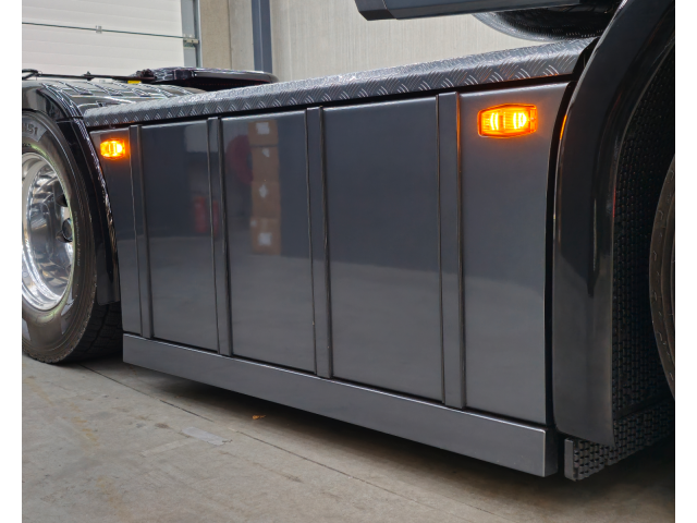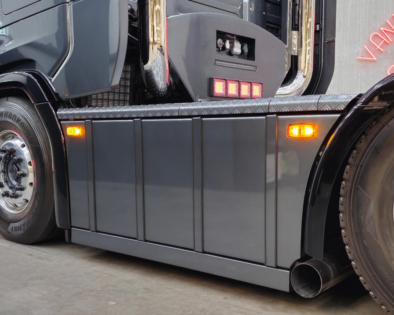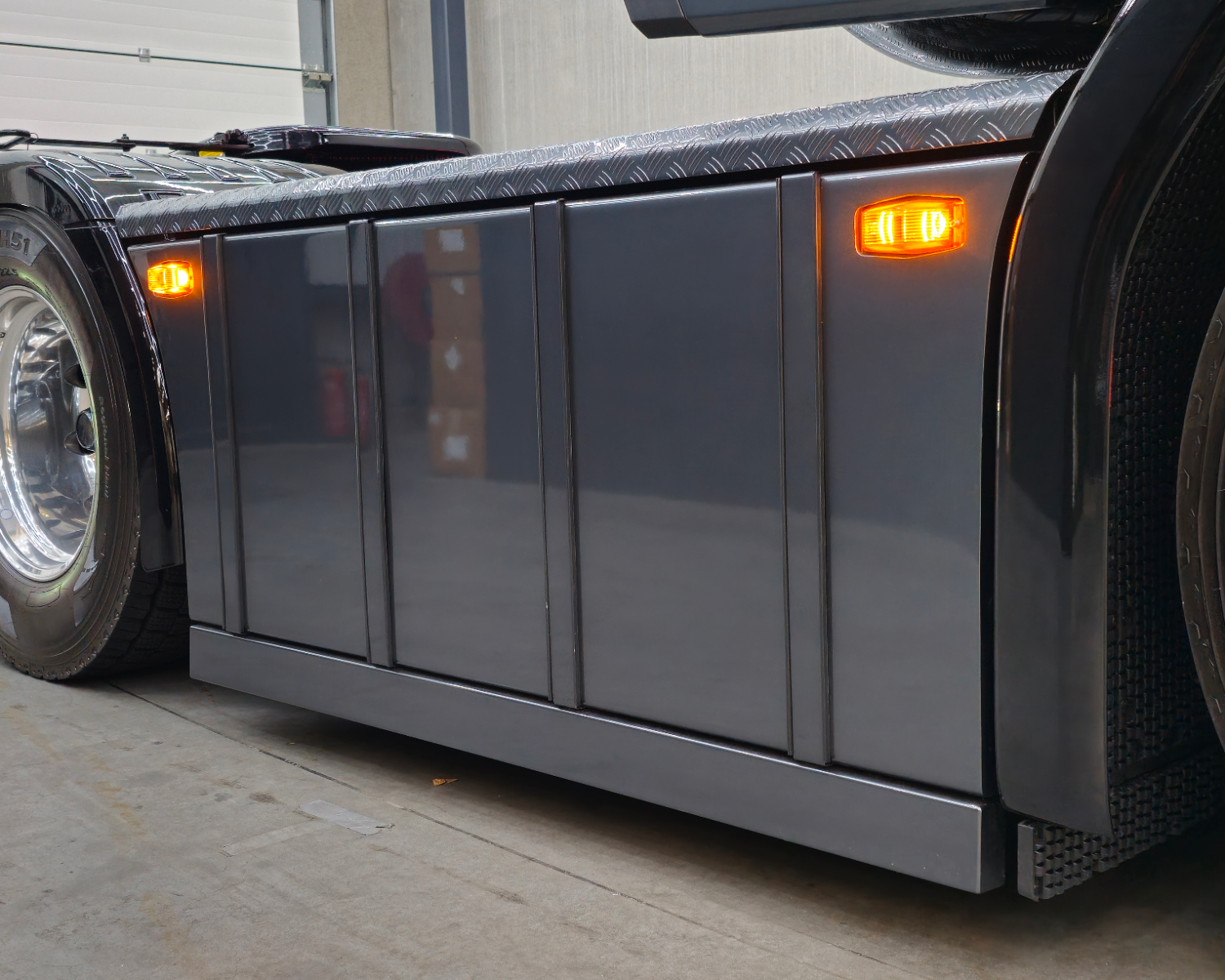 - Vlakke aluminium sideskirts met tankbanden en verdiepte dubbelbranders