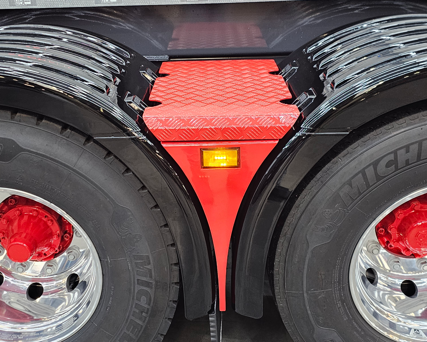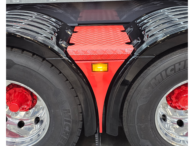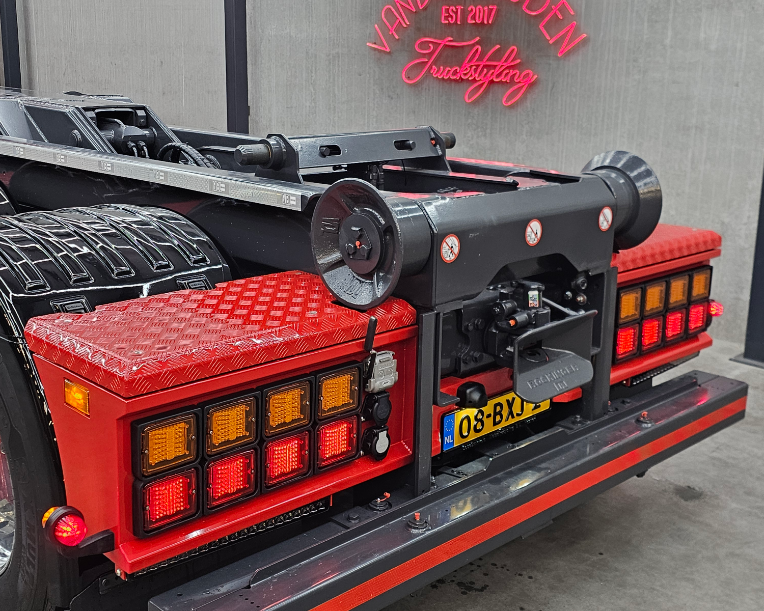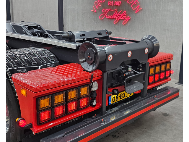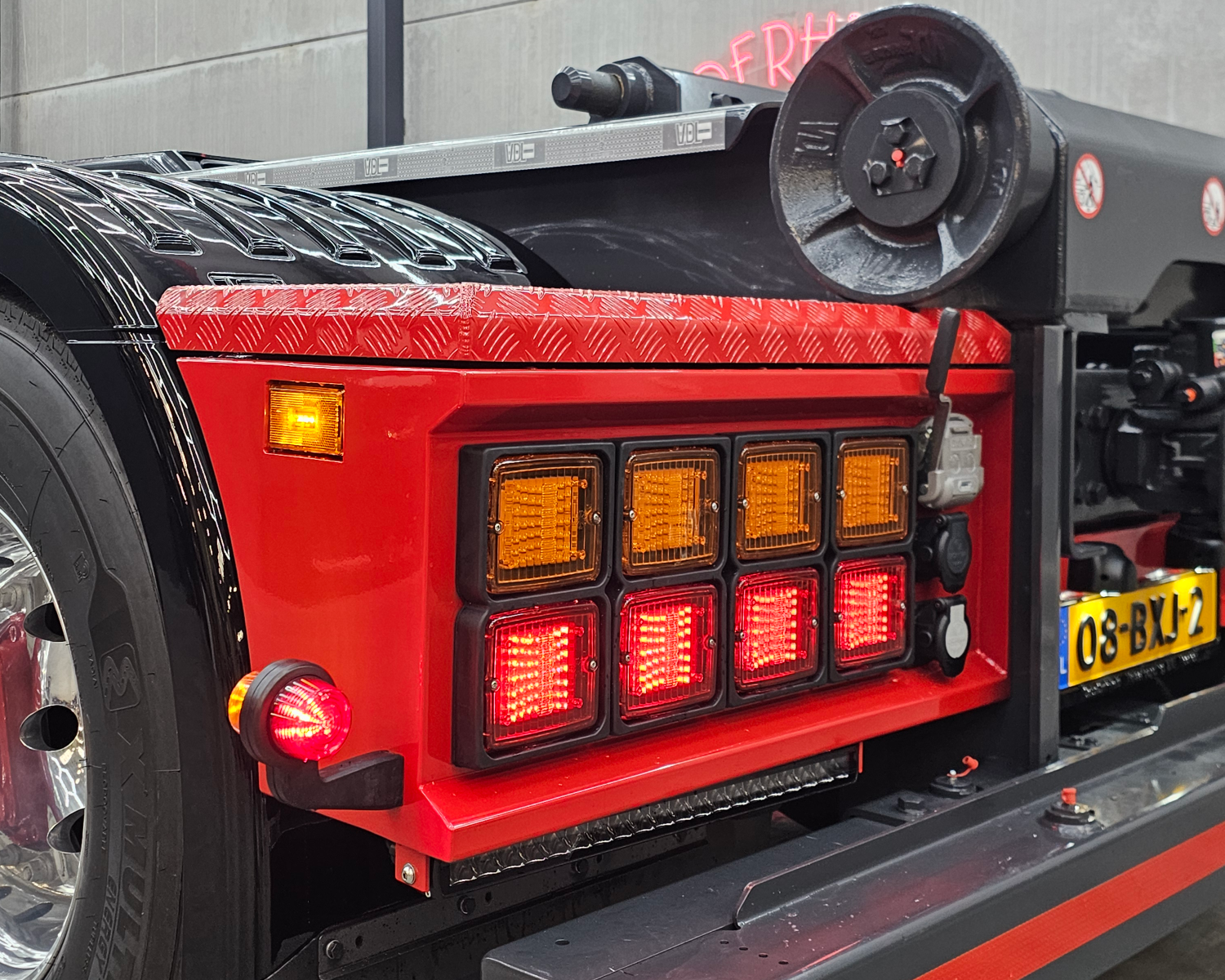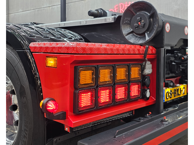 Achterbumper met en led verlichting, aansluitend aan spatborden, ook een apart middenstuk met kenteken