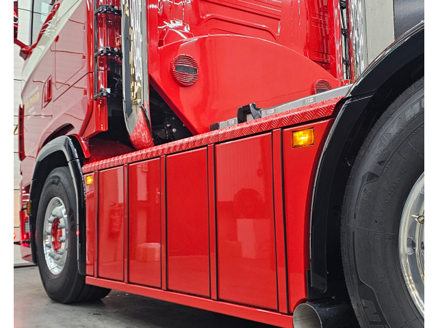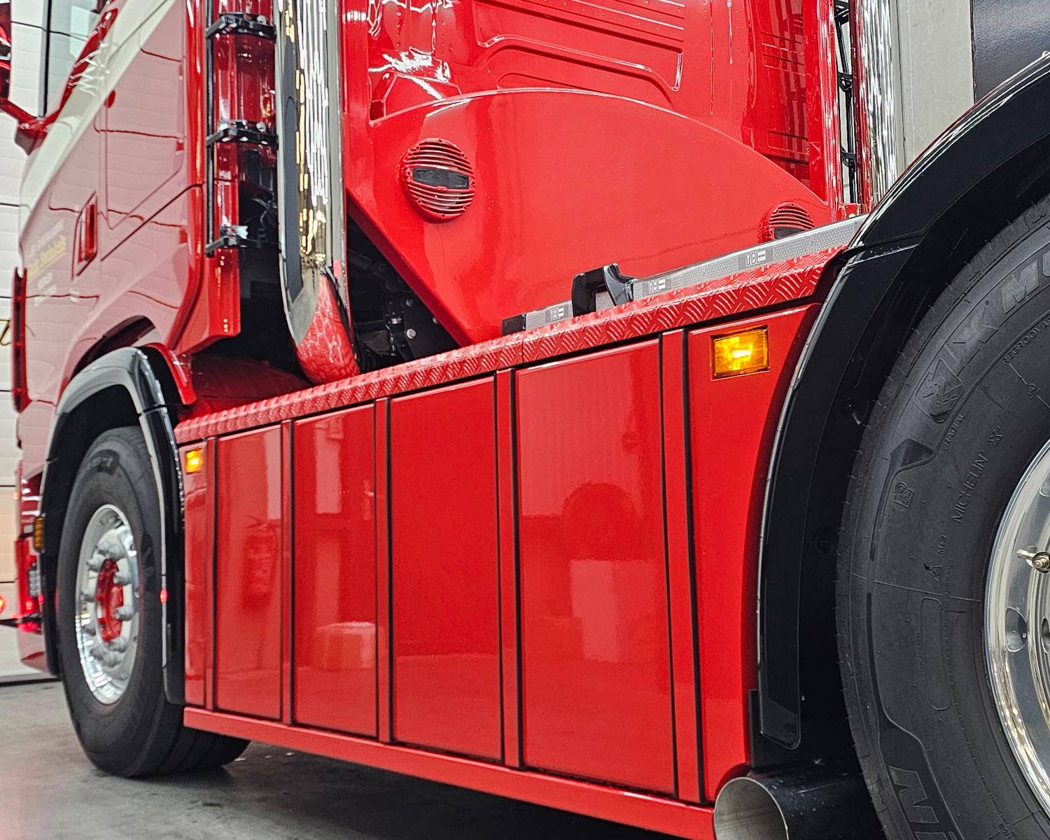 Sideskirt rechts met kist, daar zitten de accu's nu gemonteerd in 2 schuifladen