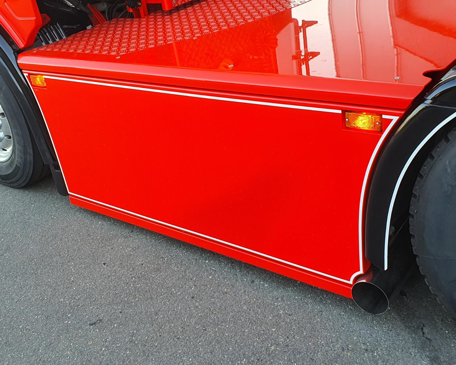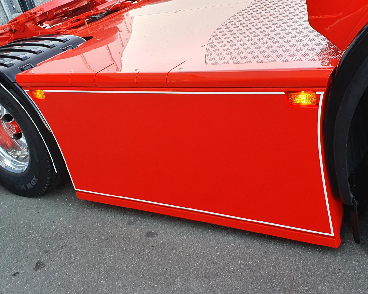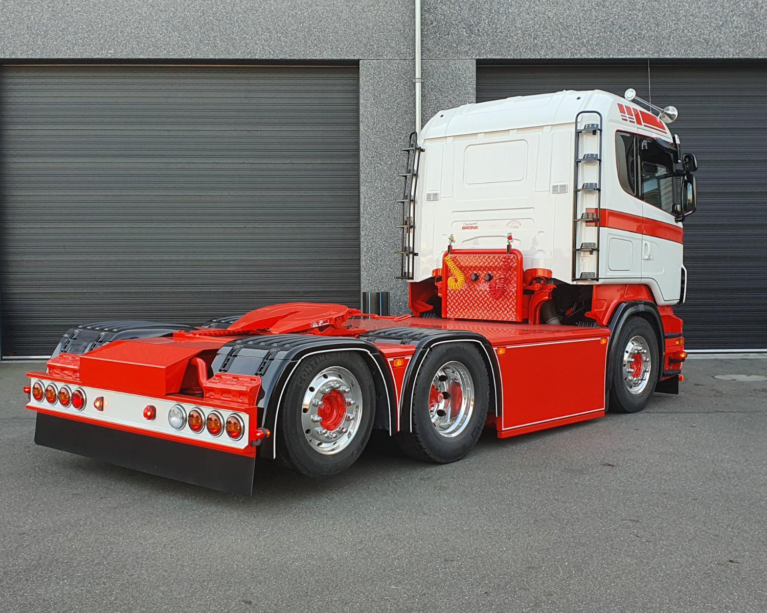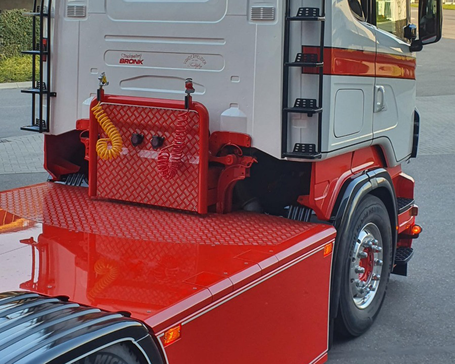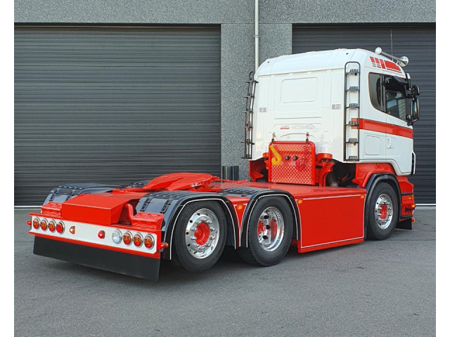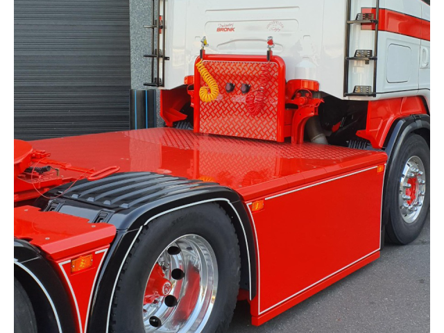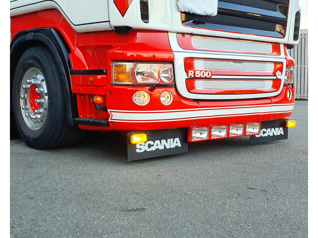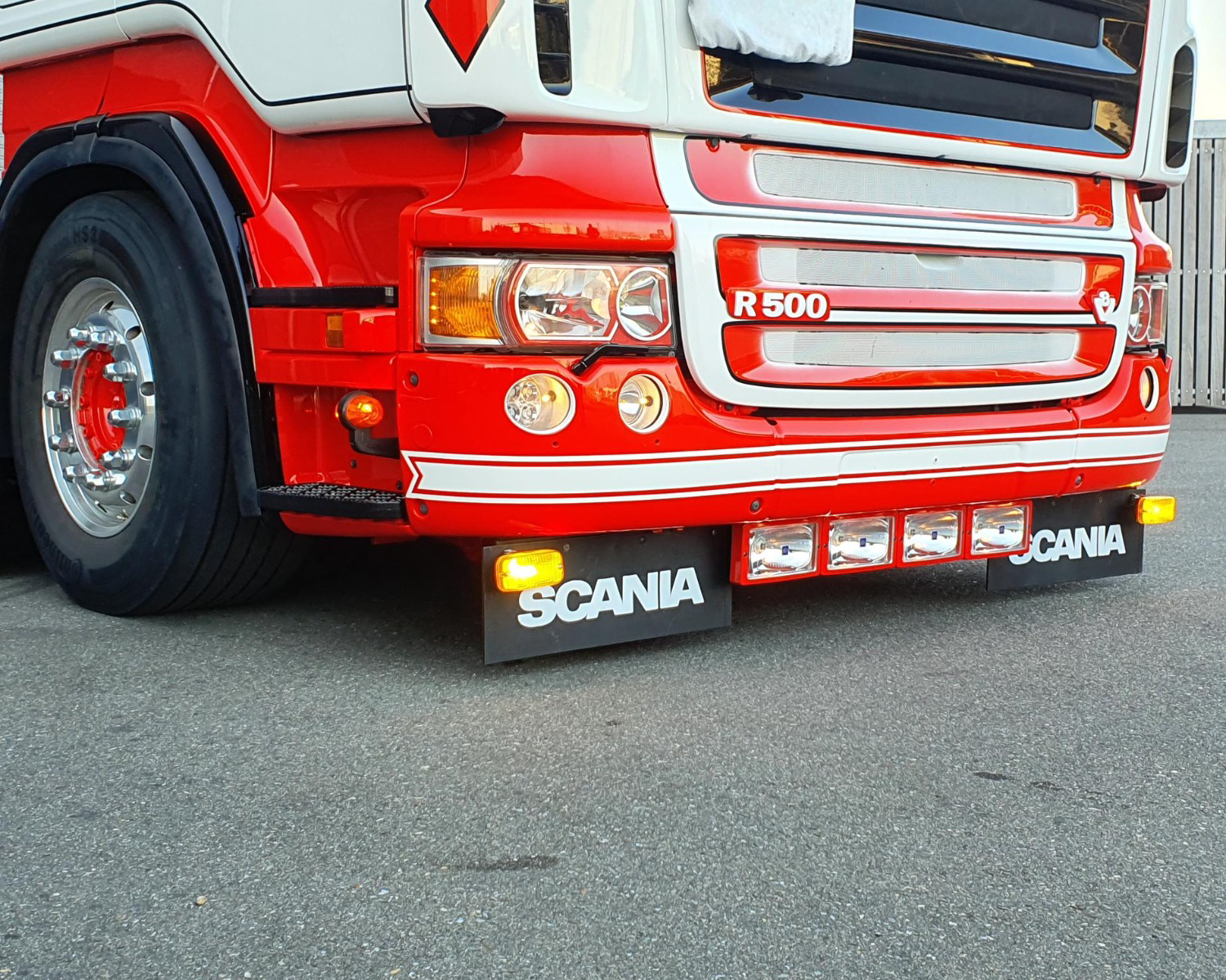 - Auto voorzien van spatbordsteunen en spatborden, de Scania was voorheen een bakwagen