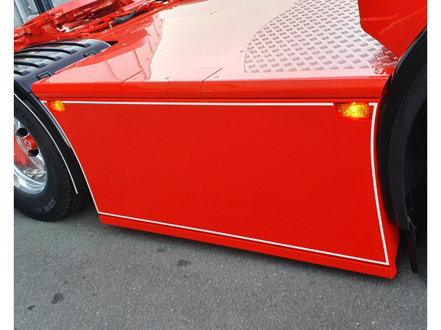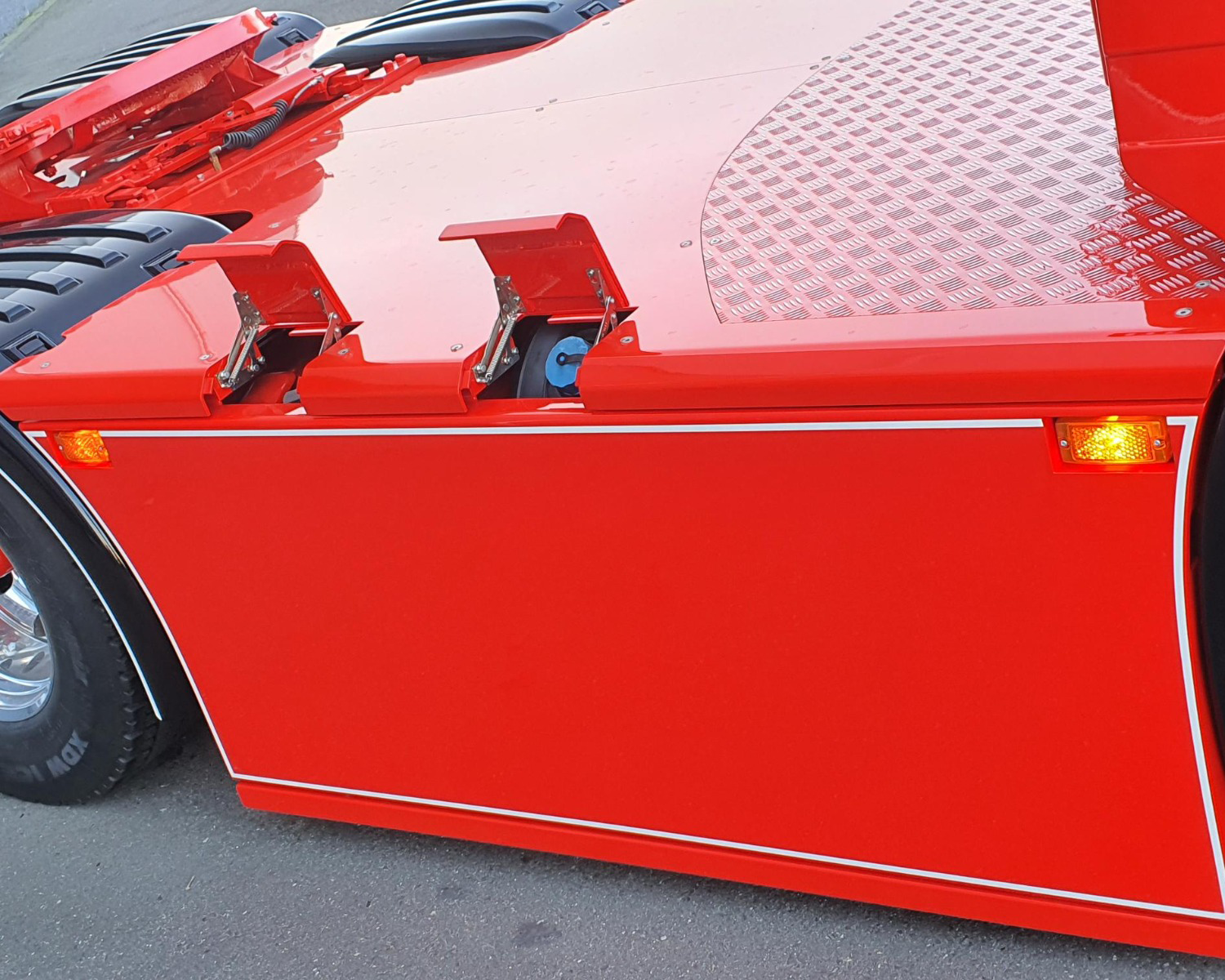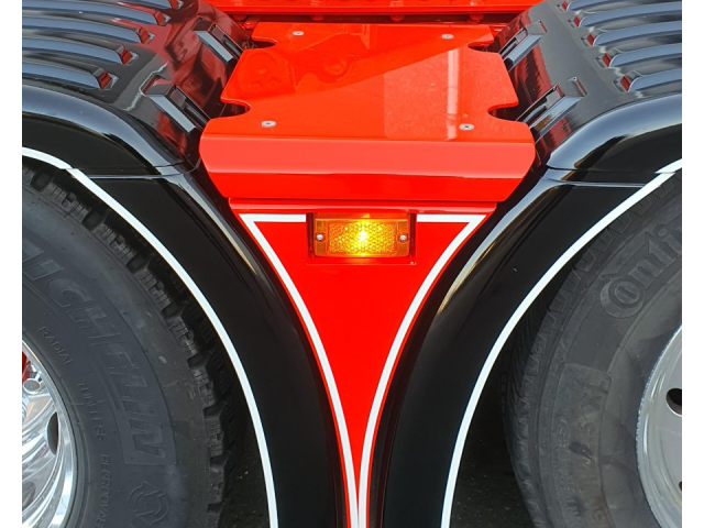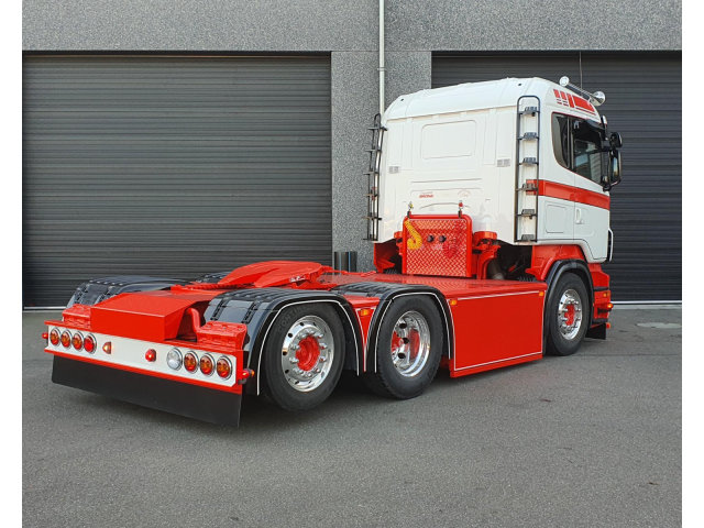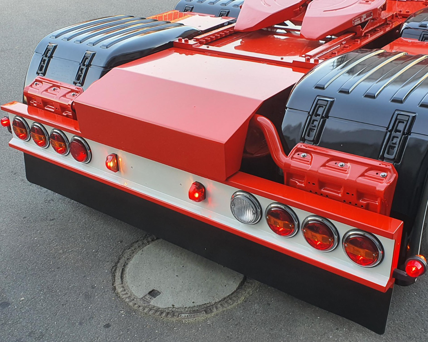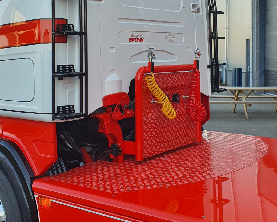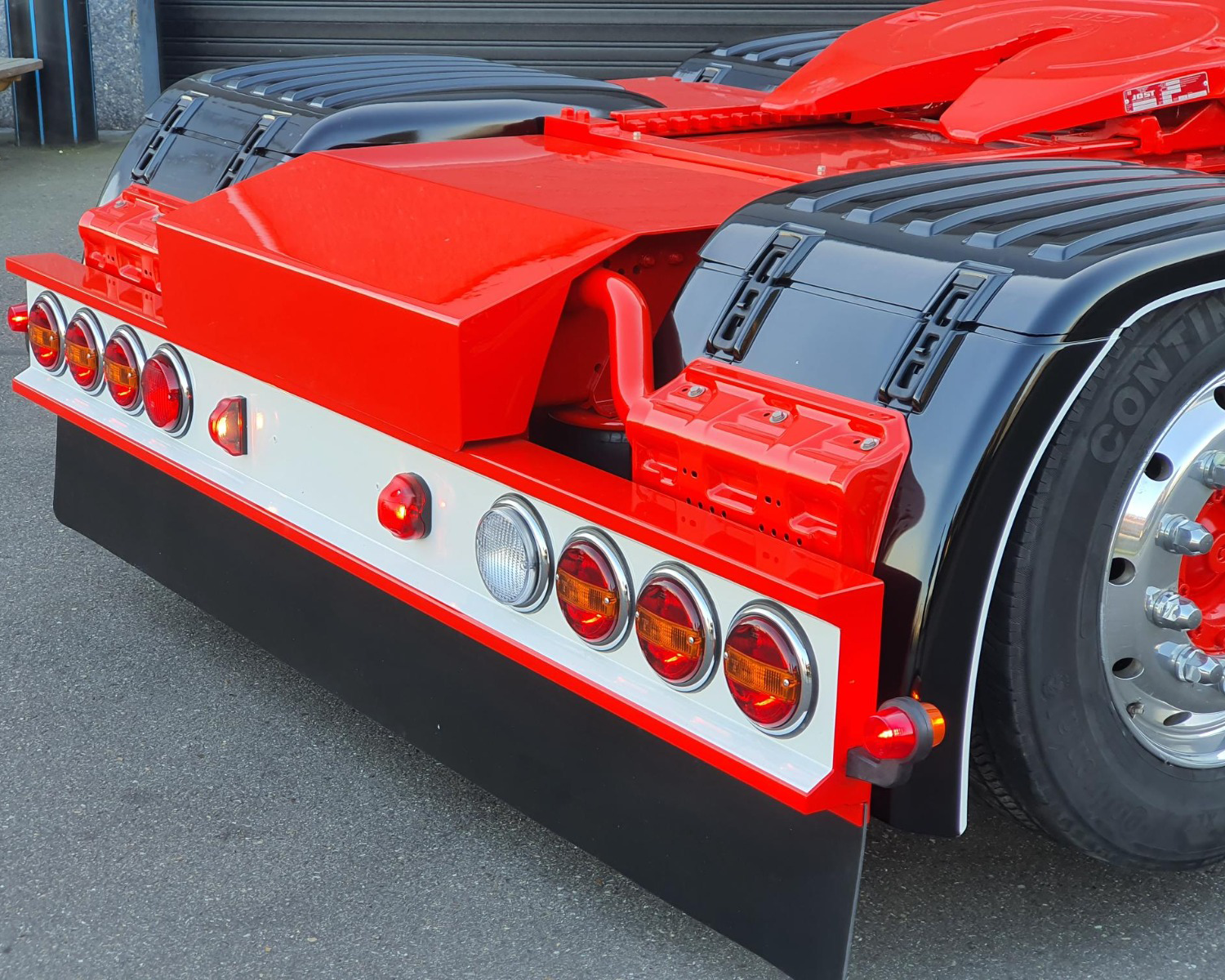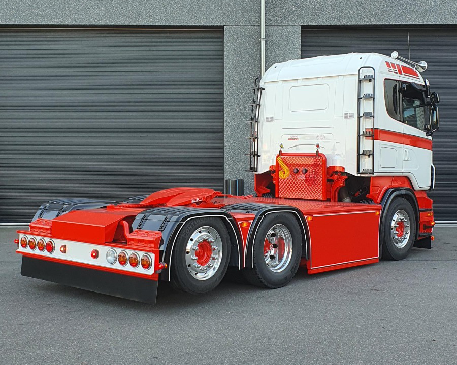 - Auto voorzien van spatbordsteunen en spatborden, de Scania was voorheen een bakwagen