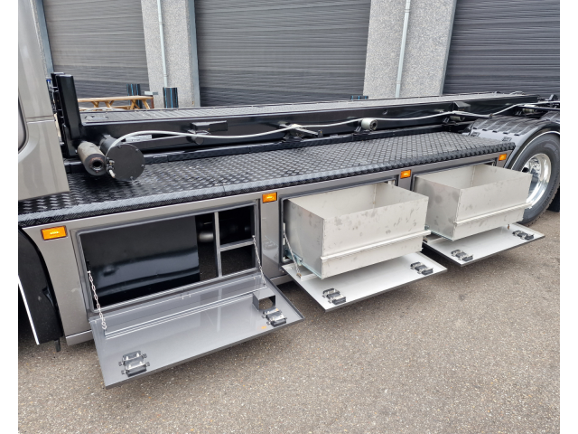 - Links een kist met 2 grote schuifladen, de stijlen van de kist breed gehouden voor de originele LED lampjes