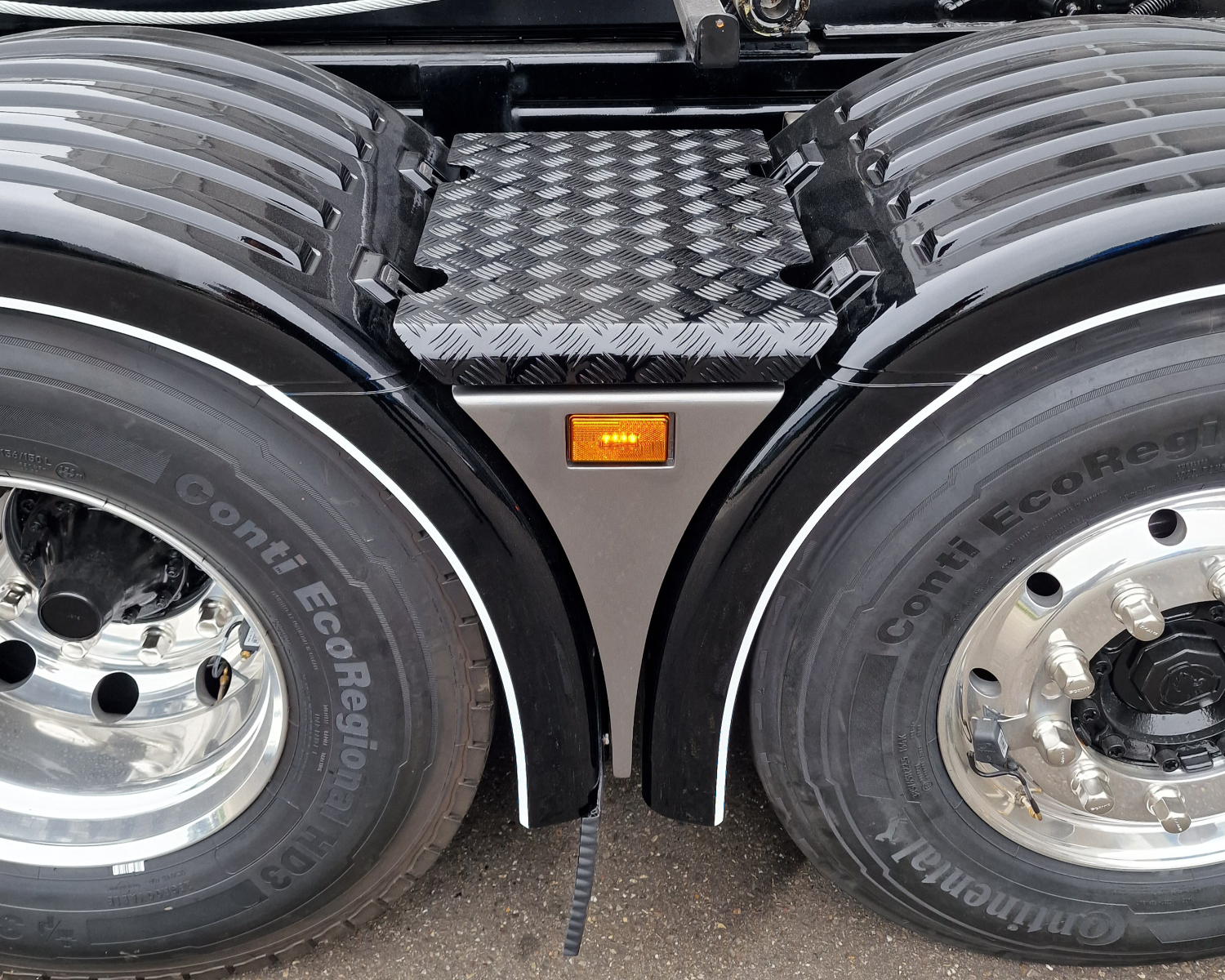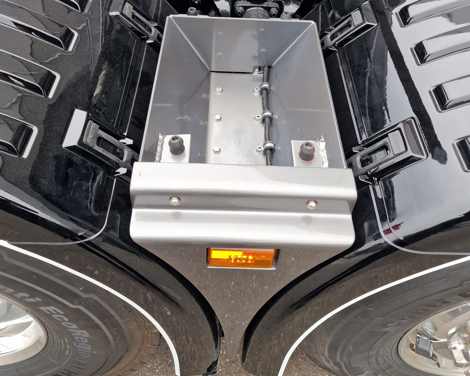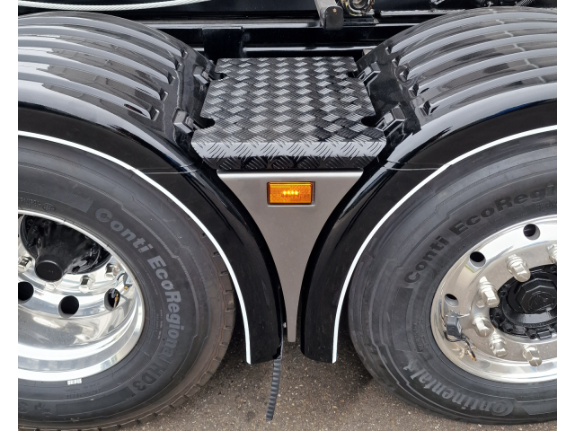 - Rechts een sideskirt met RVS gepolijste tankbanden