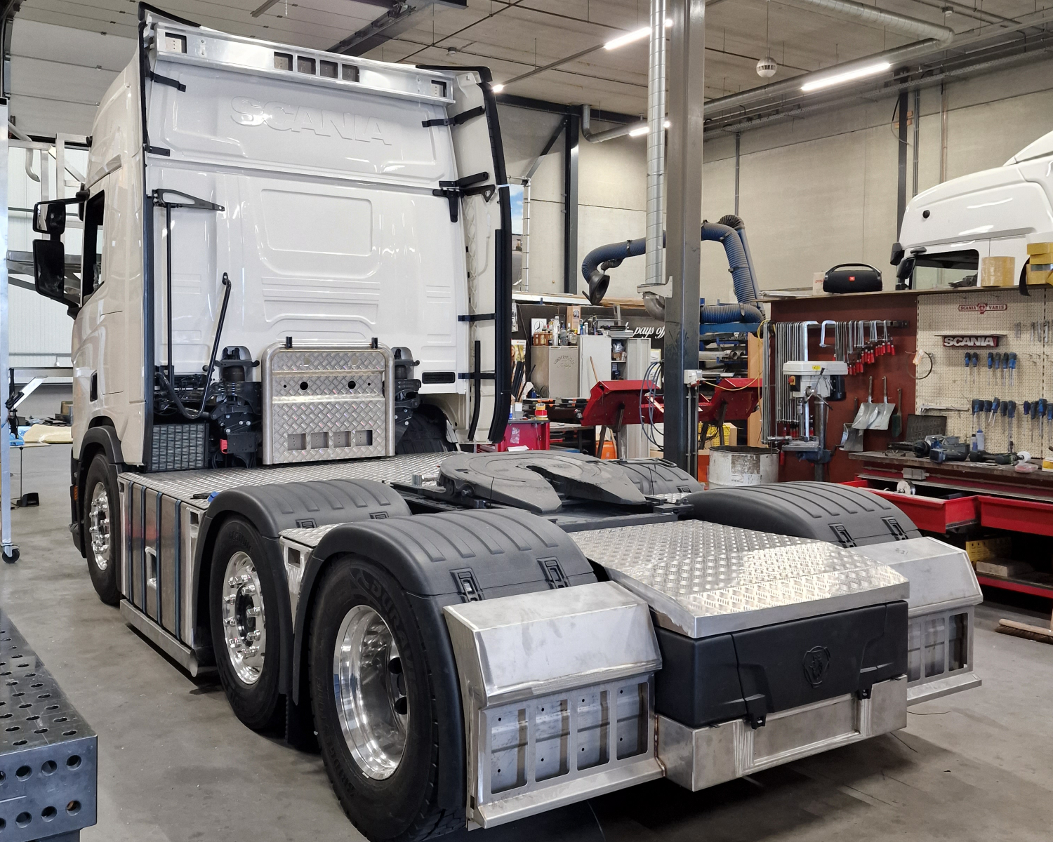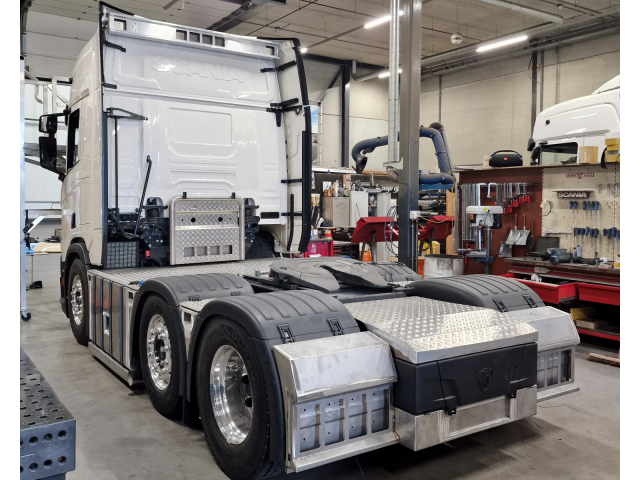 Rechts een sideskirt met Hella bloklampen erin met dezelfde rondingen als de tank