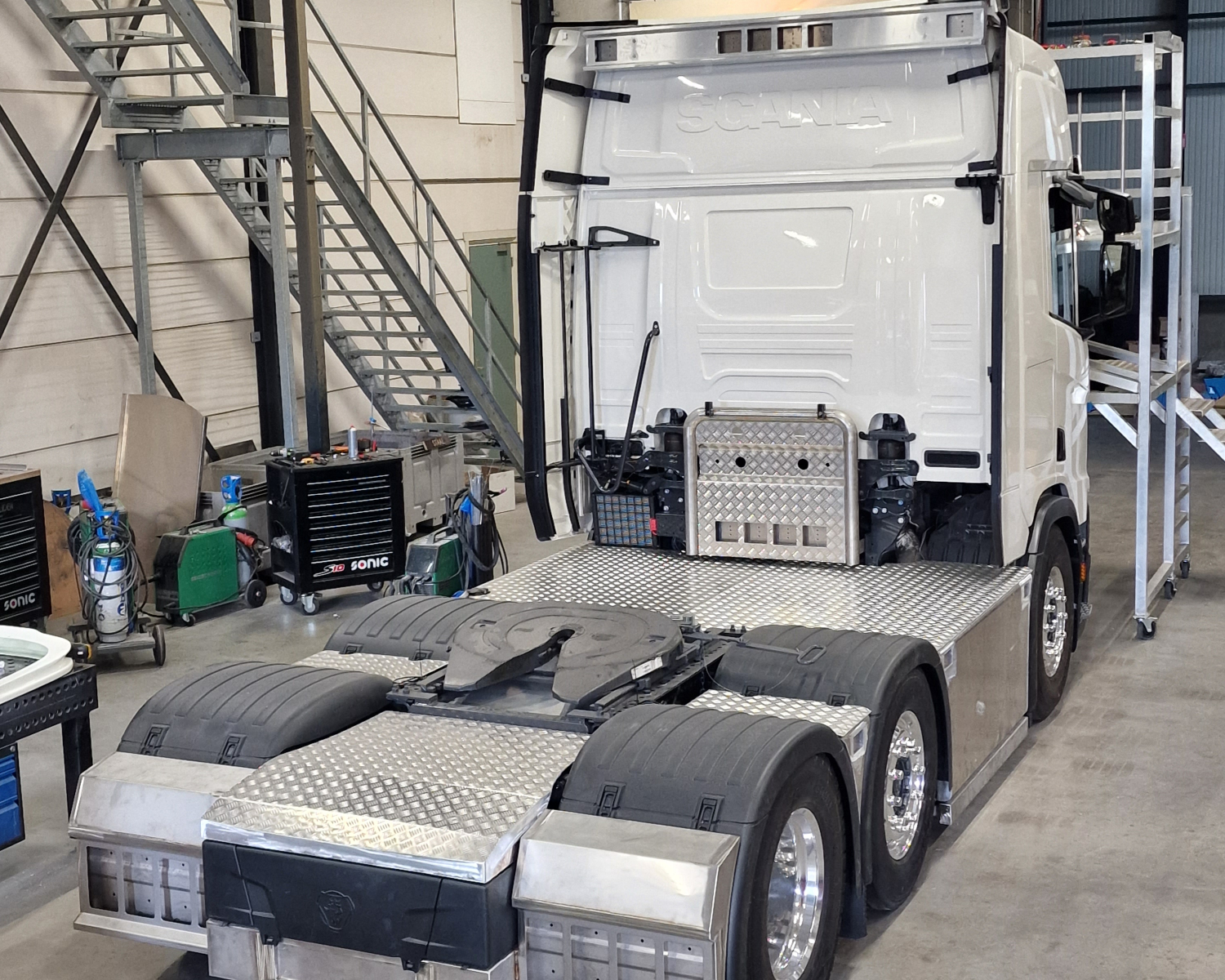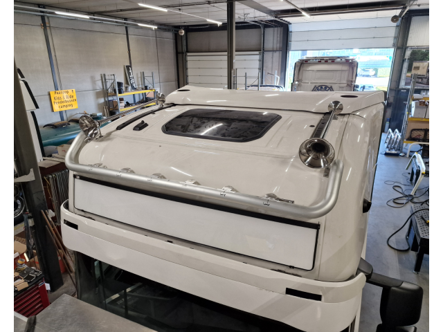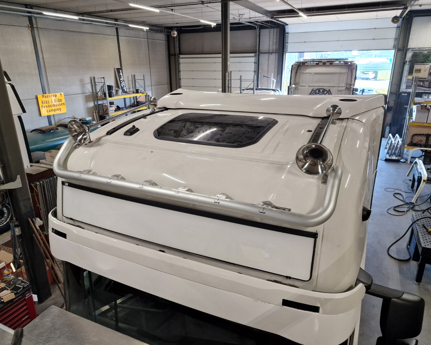 Rowin zijn R530 is klaar! Normaal zouden we dit niet doen, maar omdat ik Rowin nu een jaartje of 6 ken had ik er wel vertrouwen in. Rowin vroeg of wij de "ruwbouw" van zijn Scania wilde maken zodat hij hem zelf na het spuiten weer kon opbouwen en aansluiten.