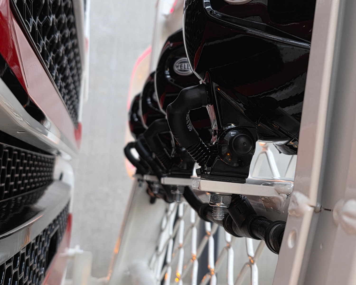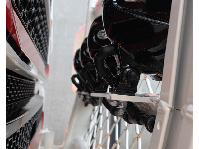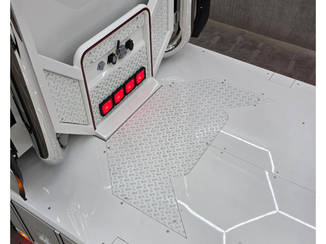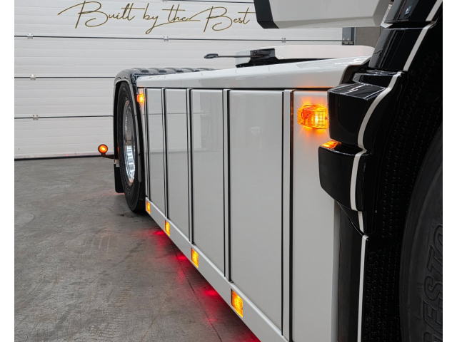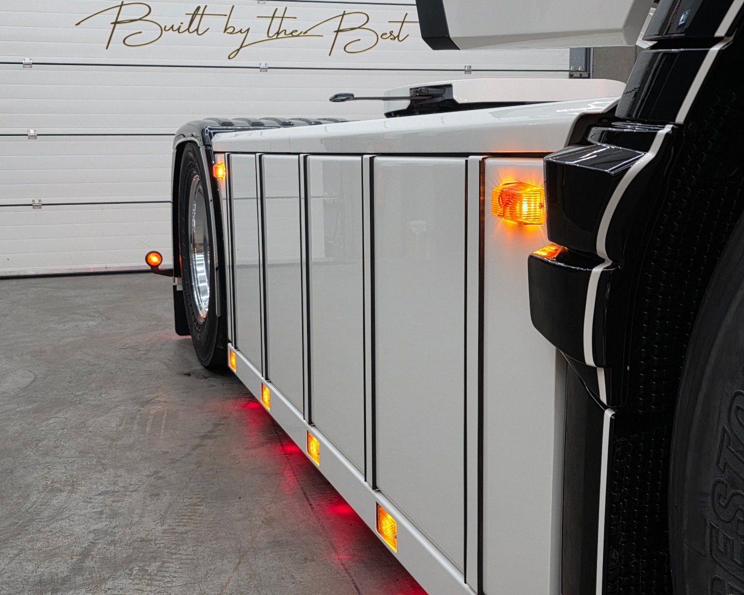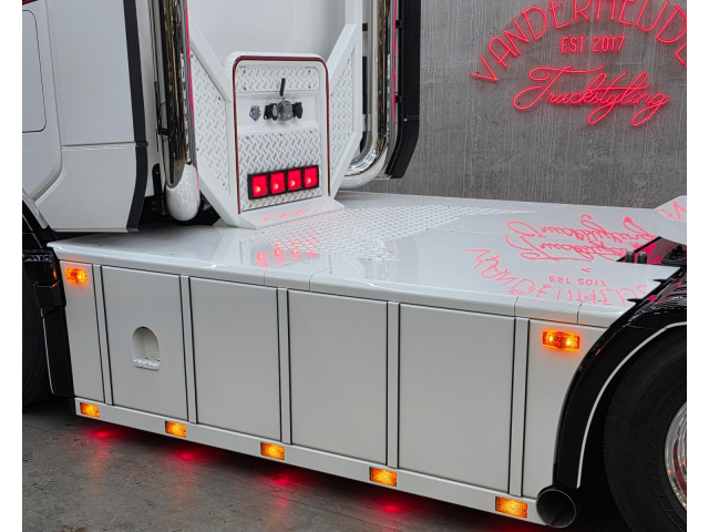 Sideskirts van 6mm aluminium met verdiepte dubbelbranders in de hoeken van de skirts