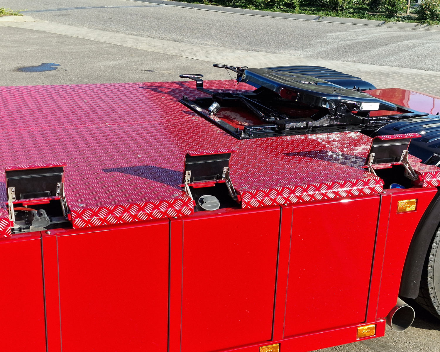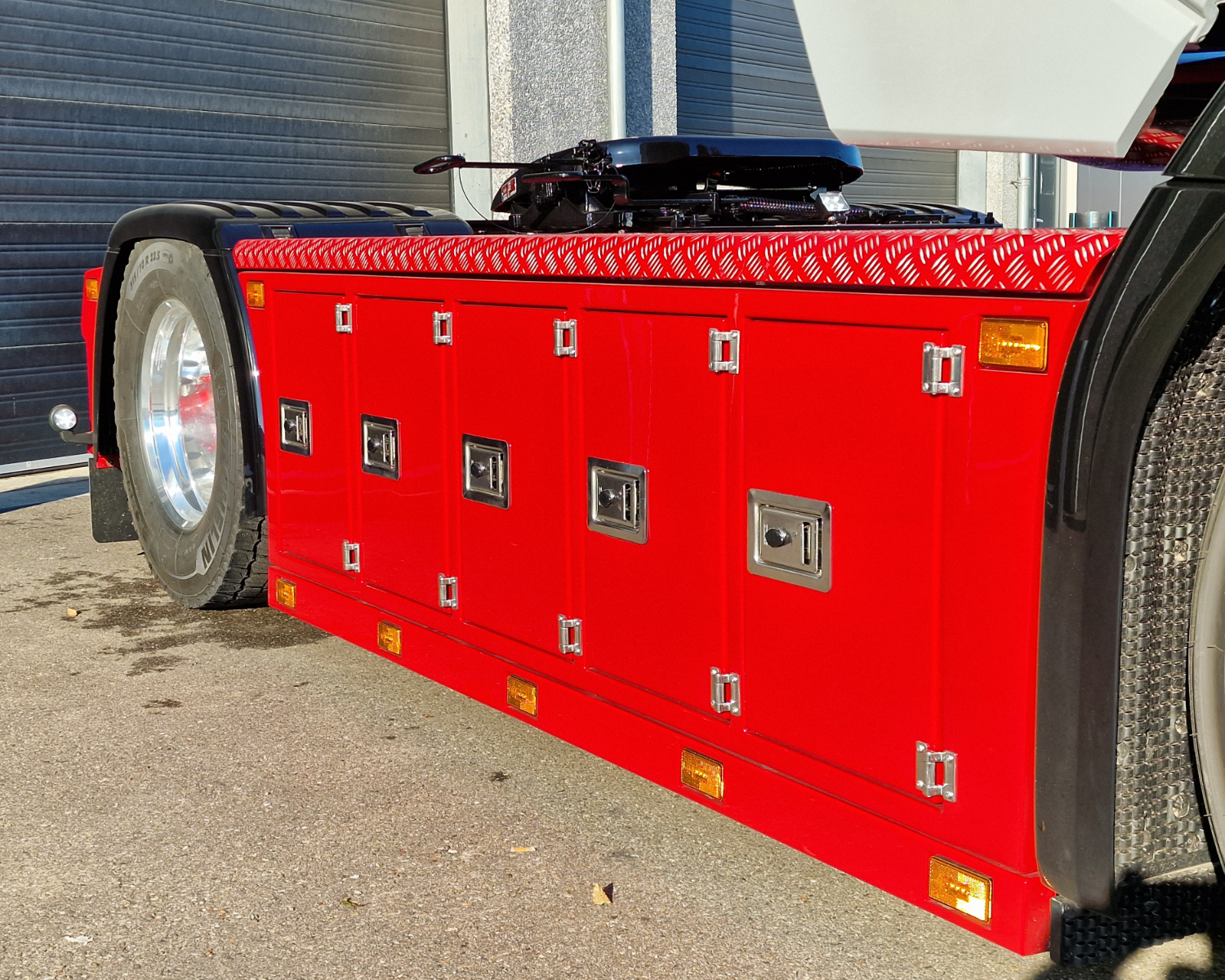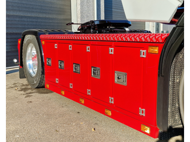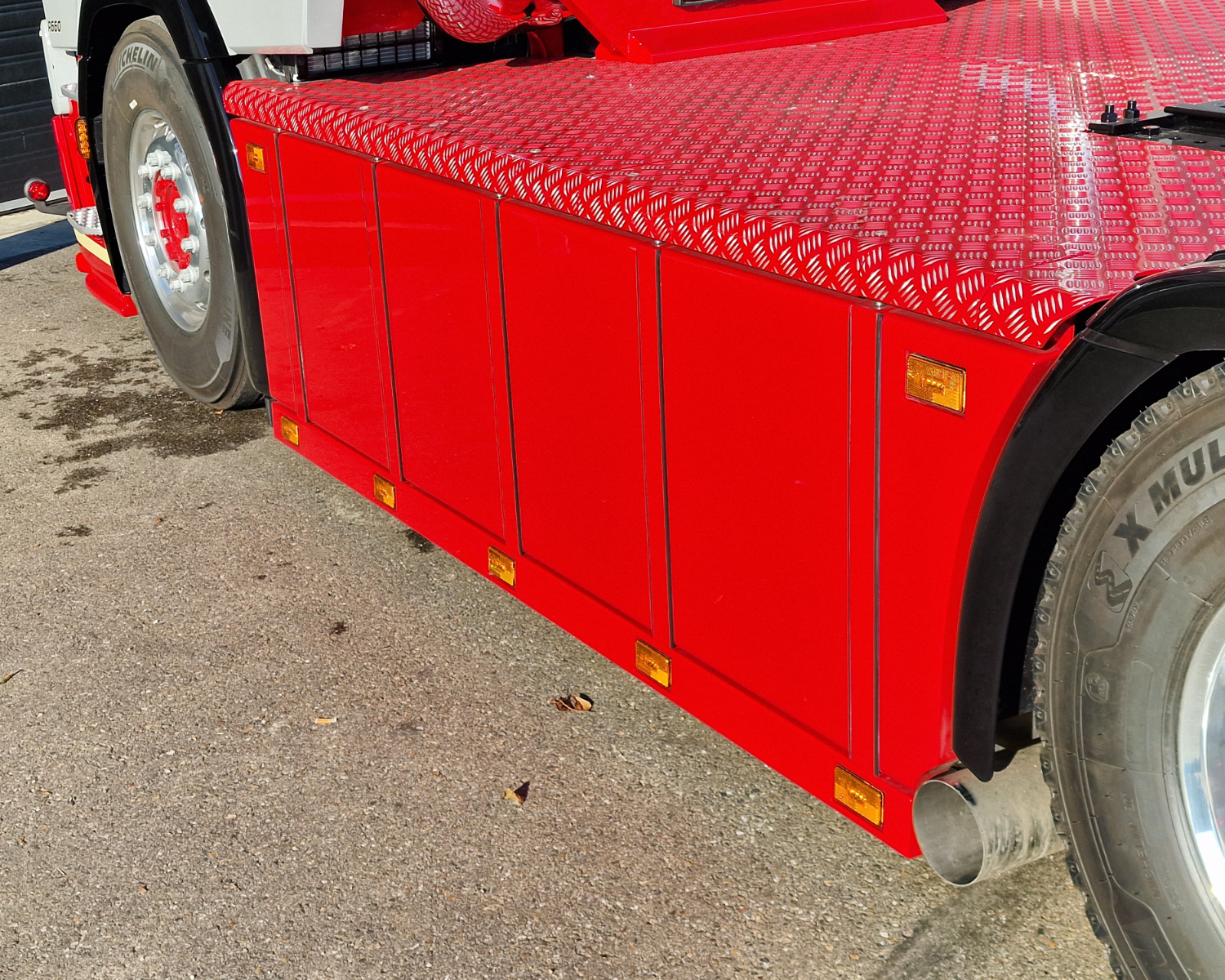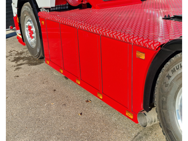 Sideskirt links van aluminium met tankbanden en originele lampjes in de hoeken