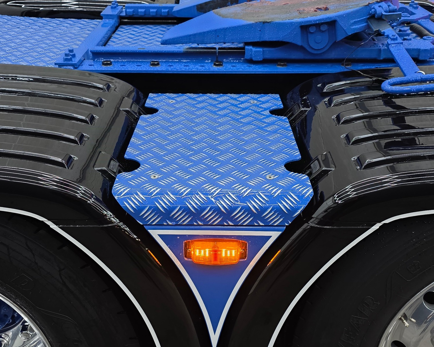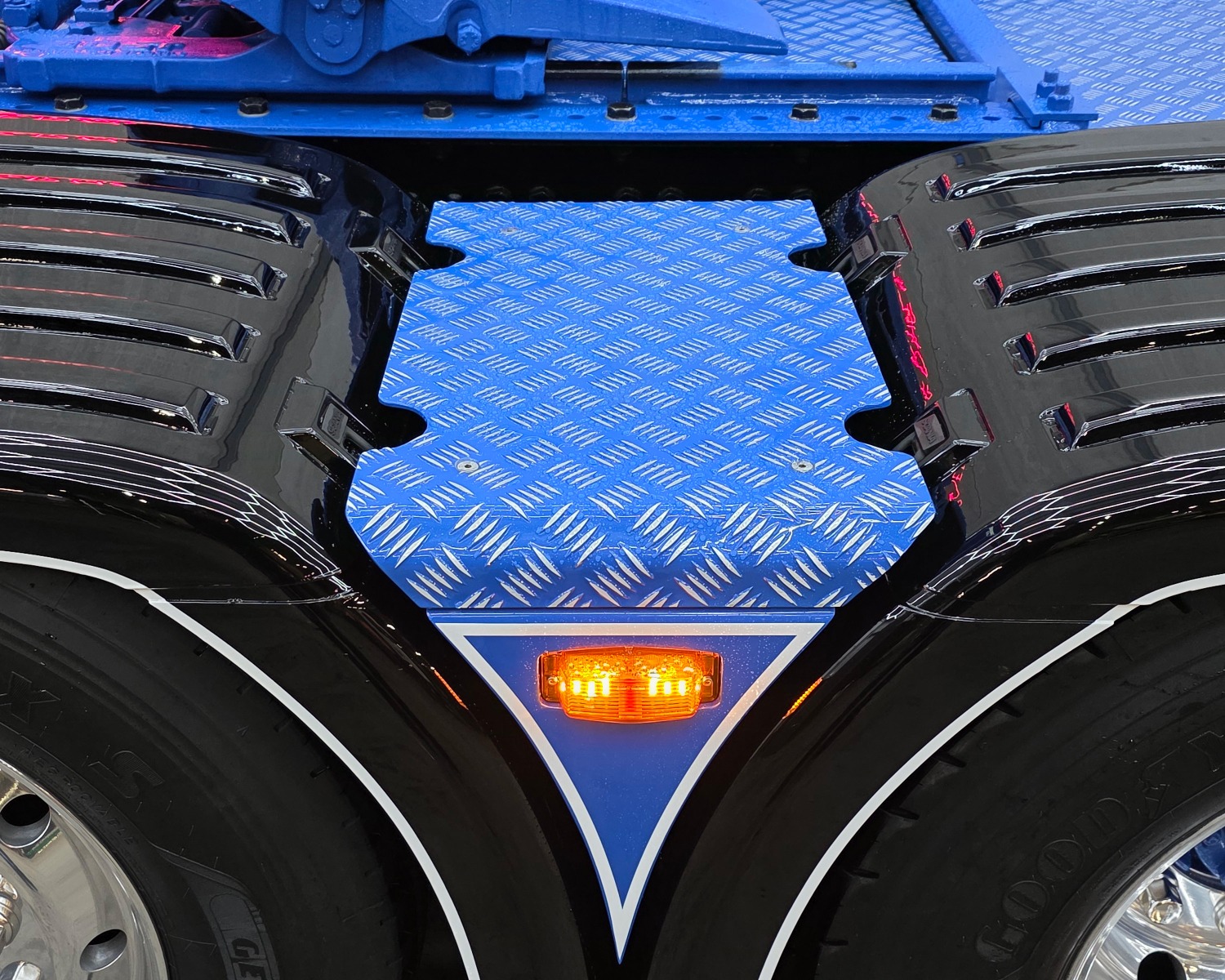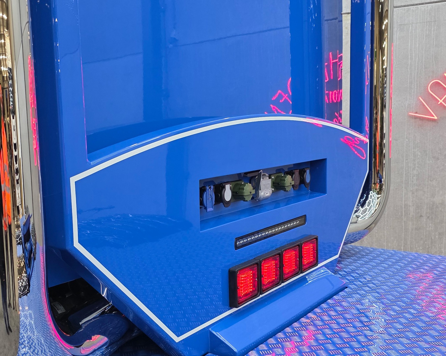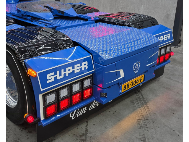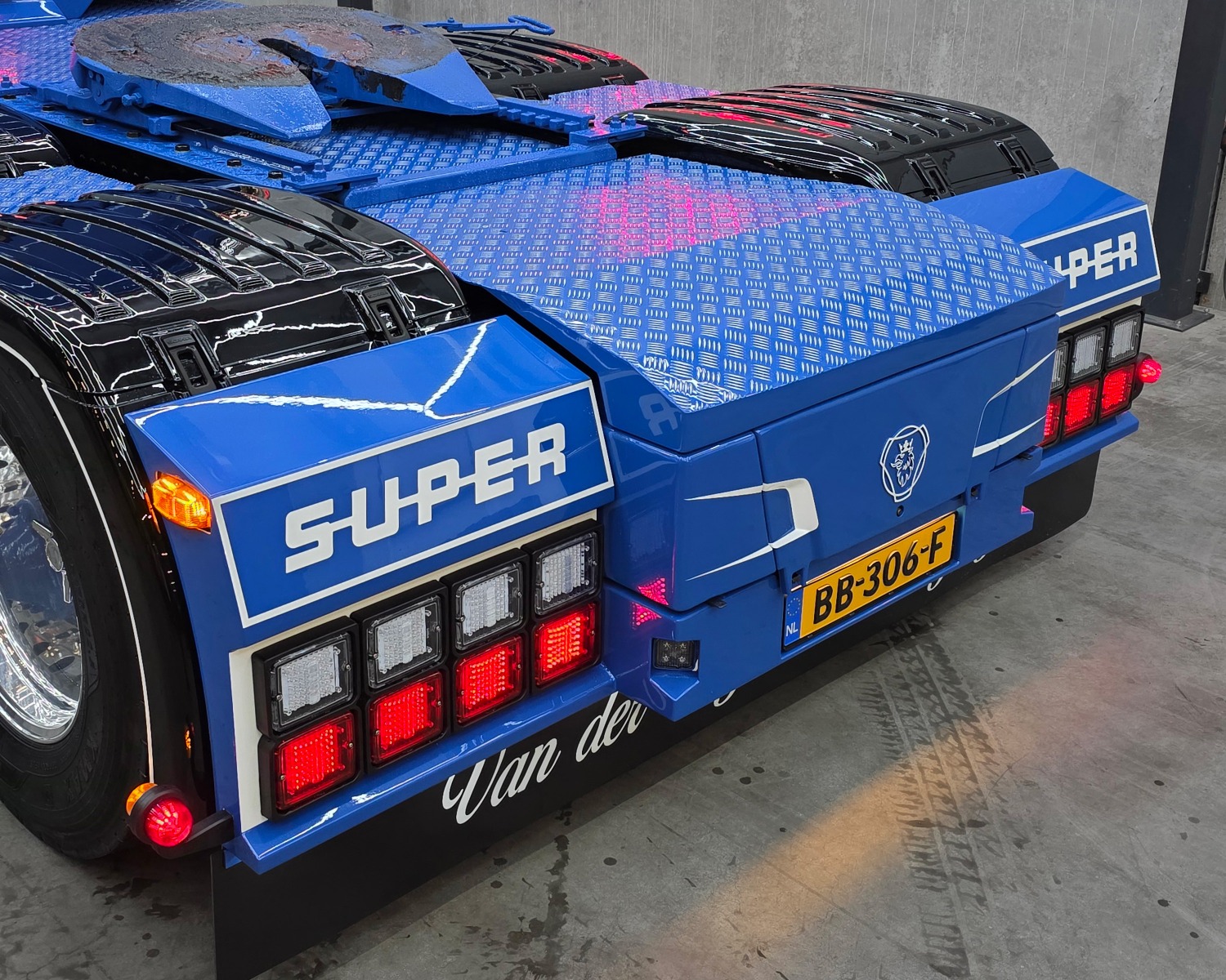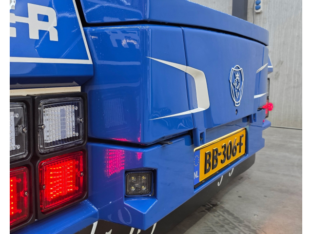 Achterbumper rvs met led verlichting aansluitend aan spatborden, ook een bakje onder de accu's met werklampen schuin erin verdiept
