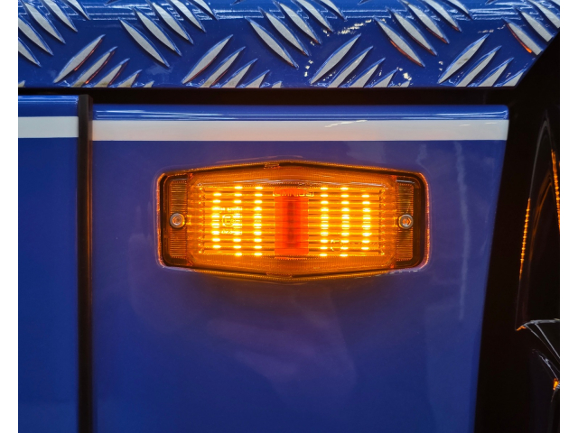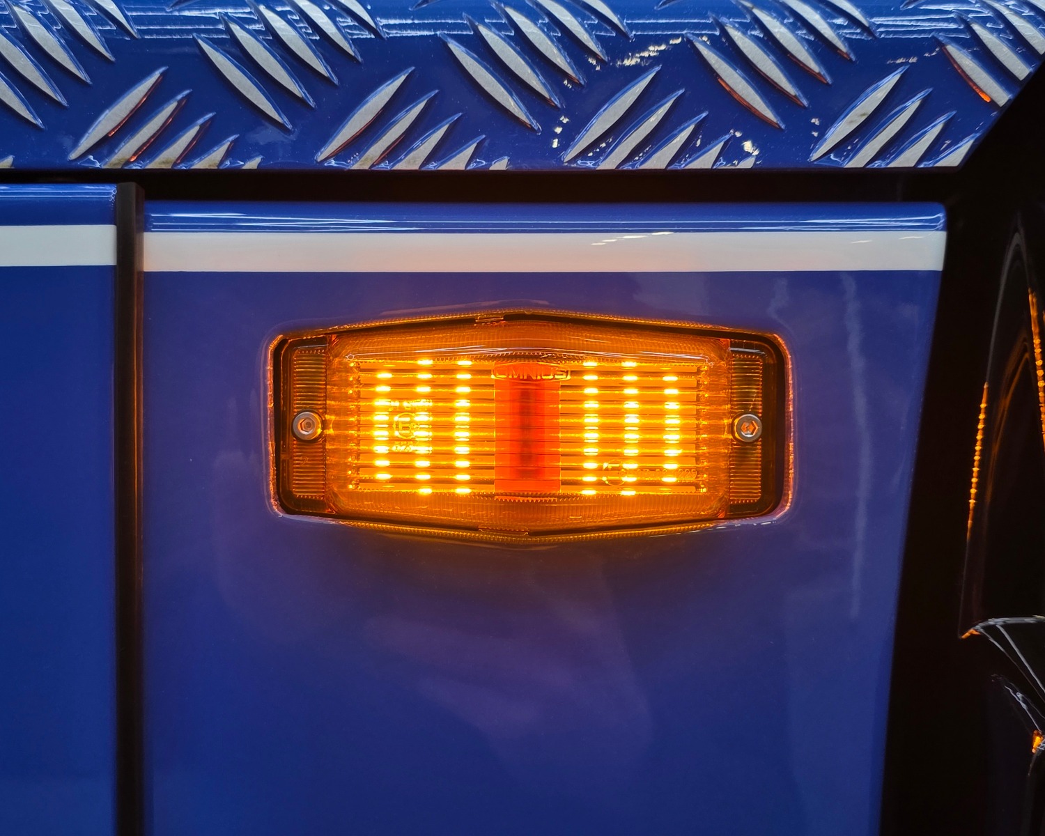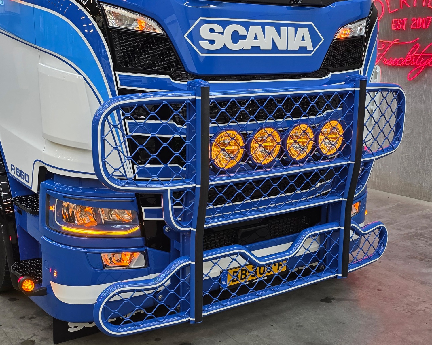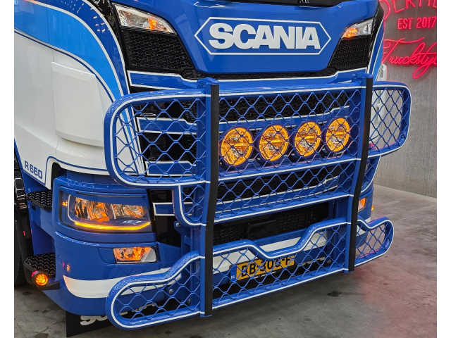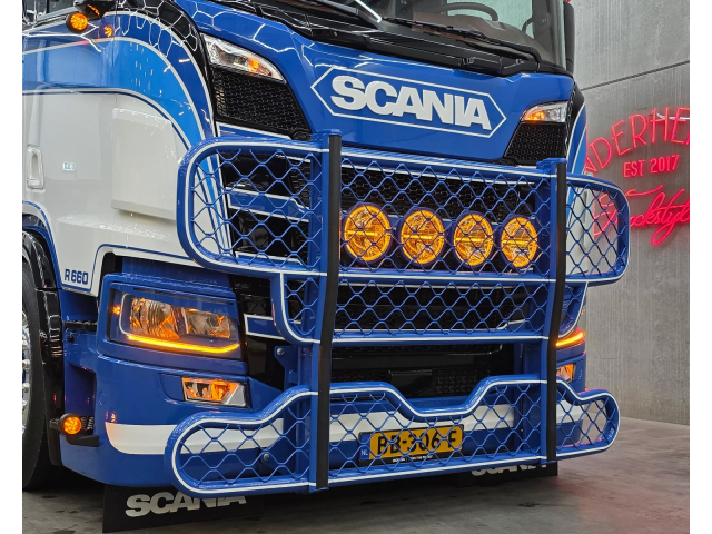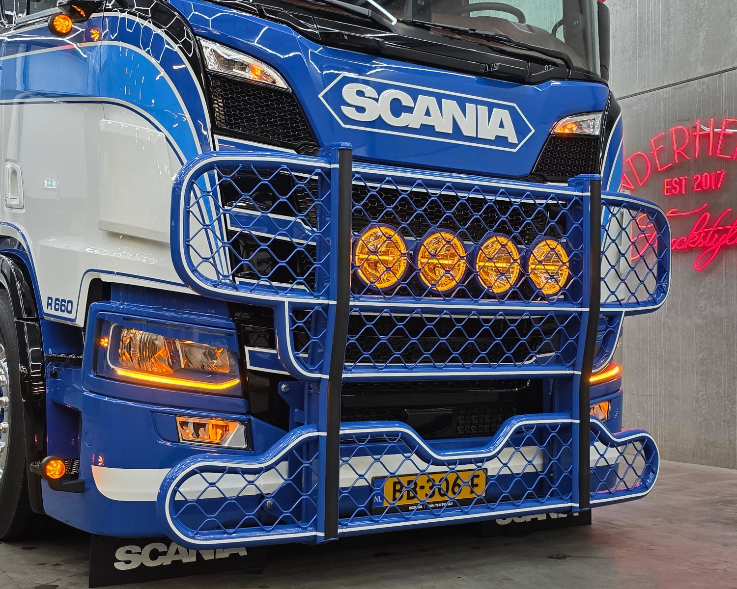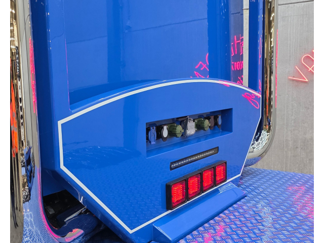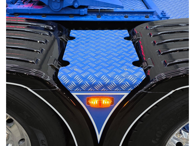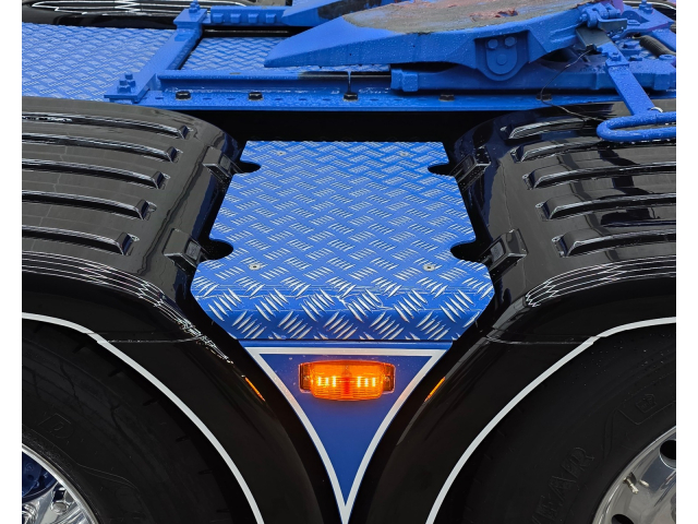 Achterbumper rvs met led verlichting aansluitend aan spatborden, ook een bakje onder de accu's met werklampen schuin erin verdiept