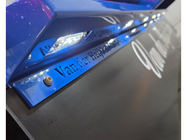 Vlakke aluminium achterwand met led bloklampen en uitgelaserde verlichtte tekst