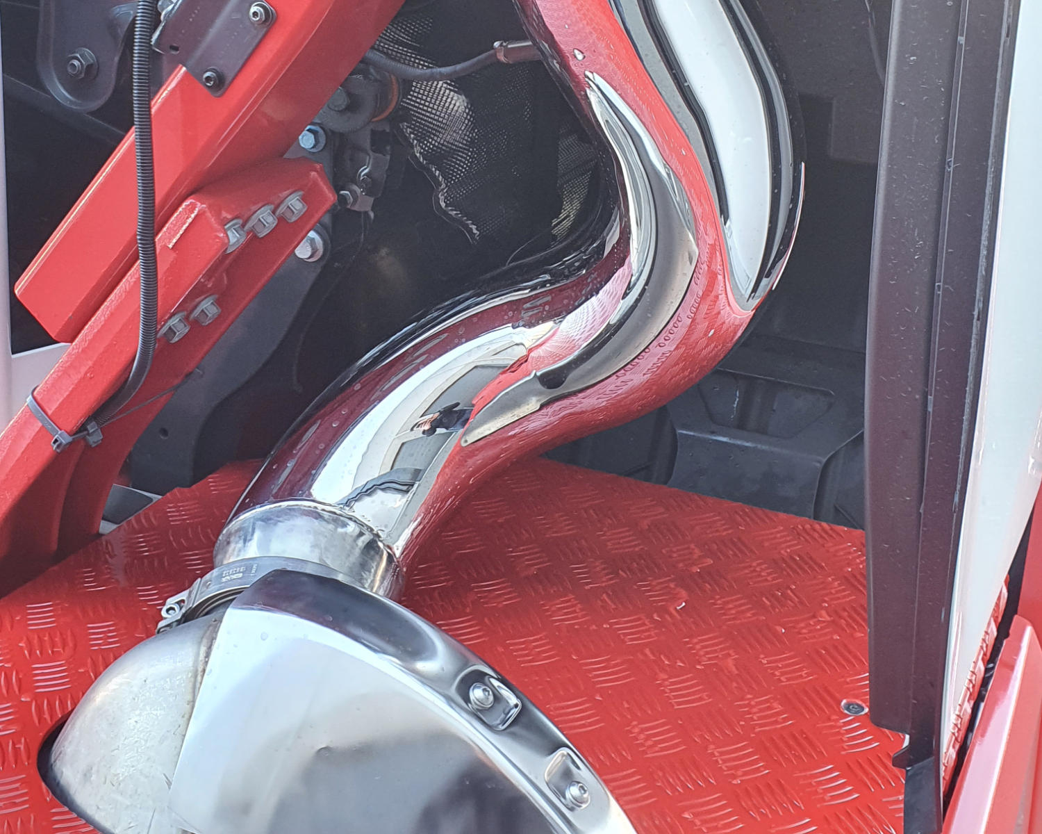 - Gepolijste rvs-pijp op de originele dempermond aangesloten