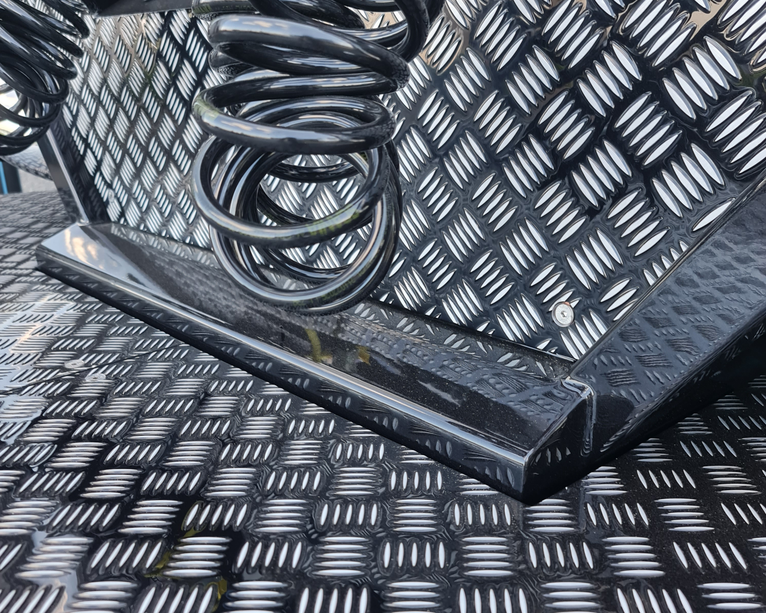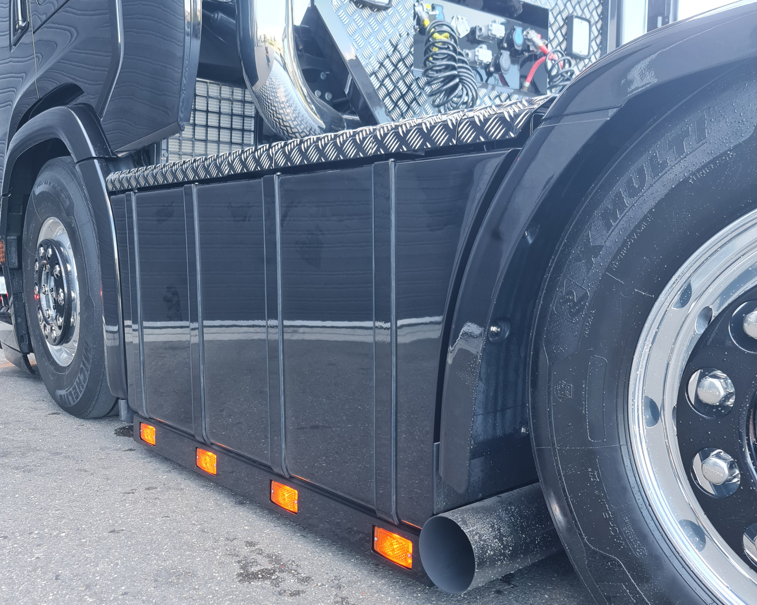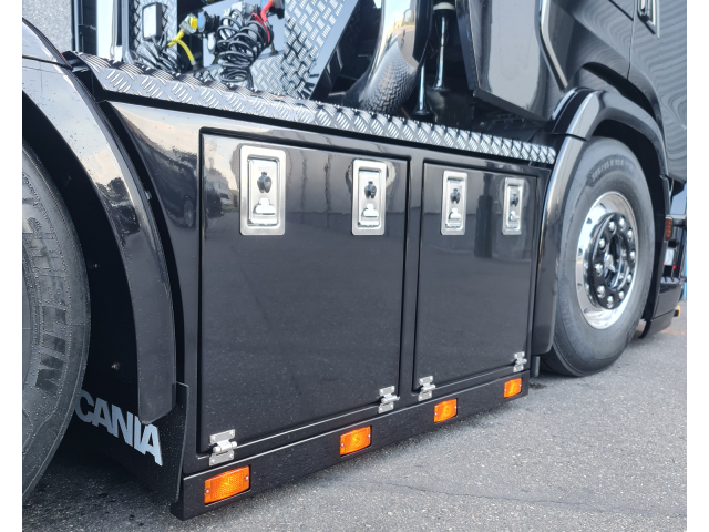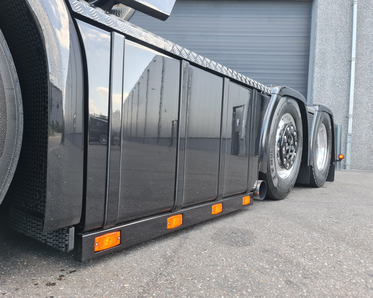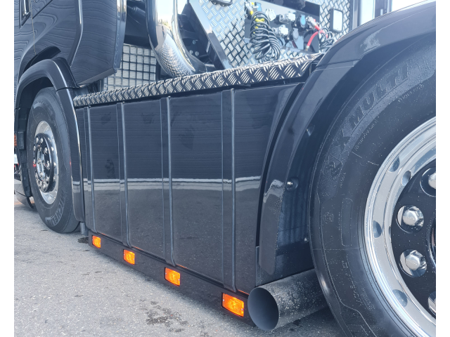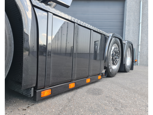 - Links een nieuwe sideskirt met tankbanden en een ronde onderkant
