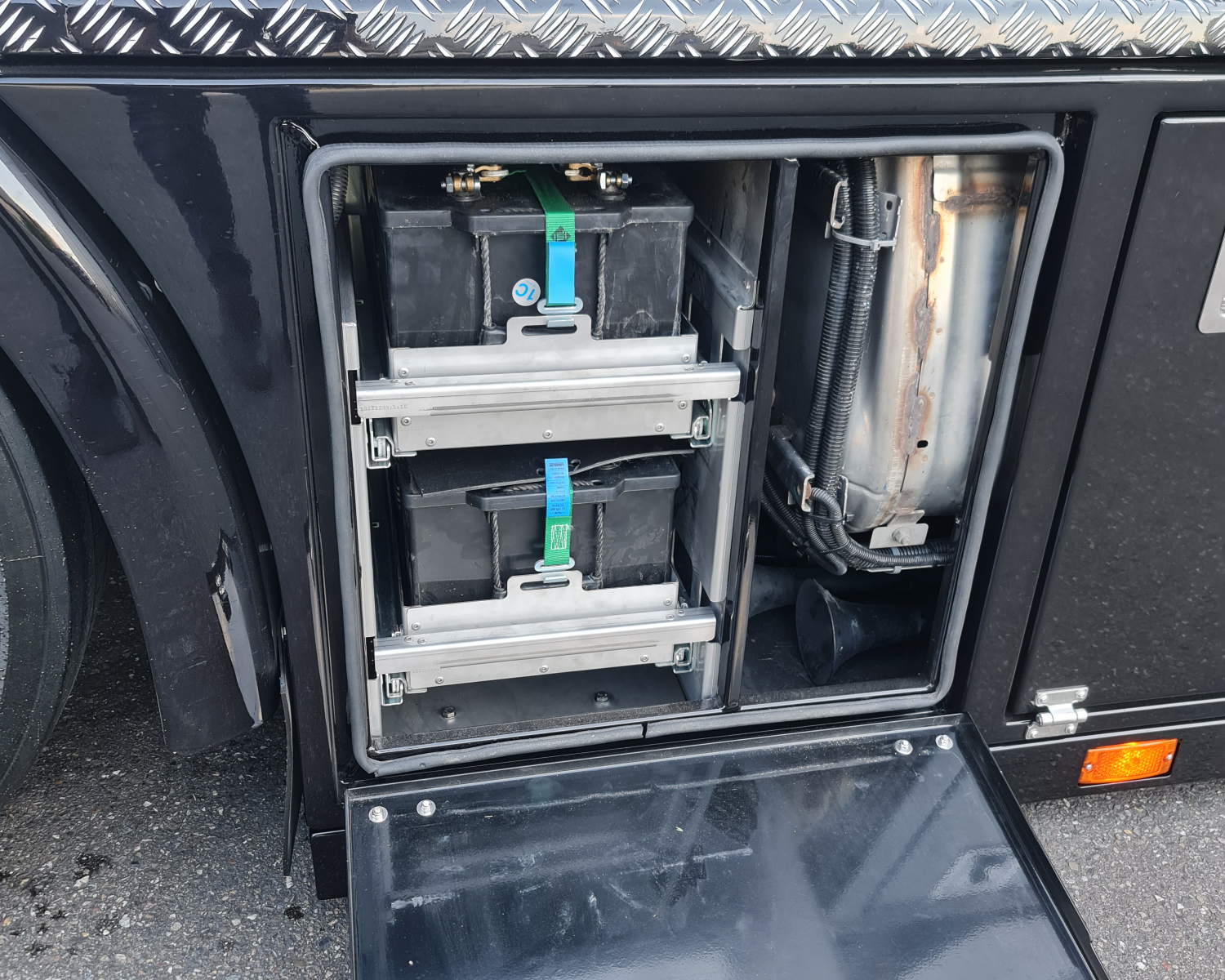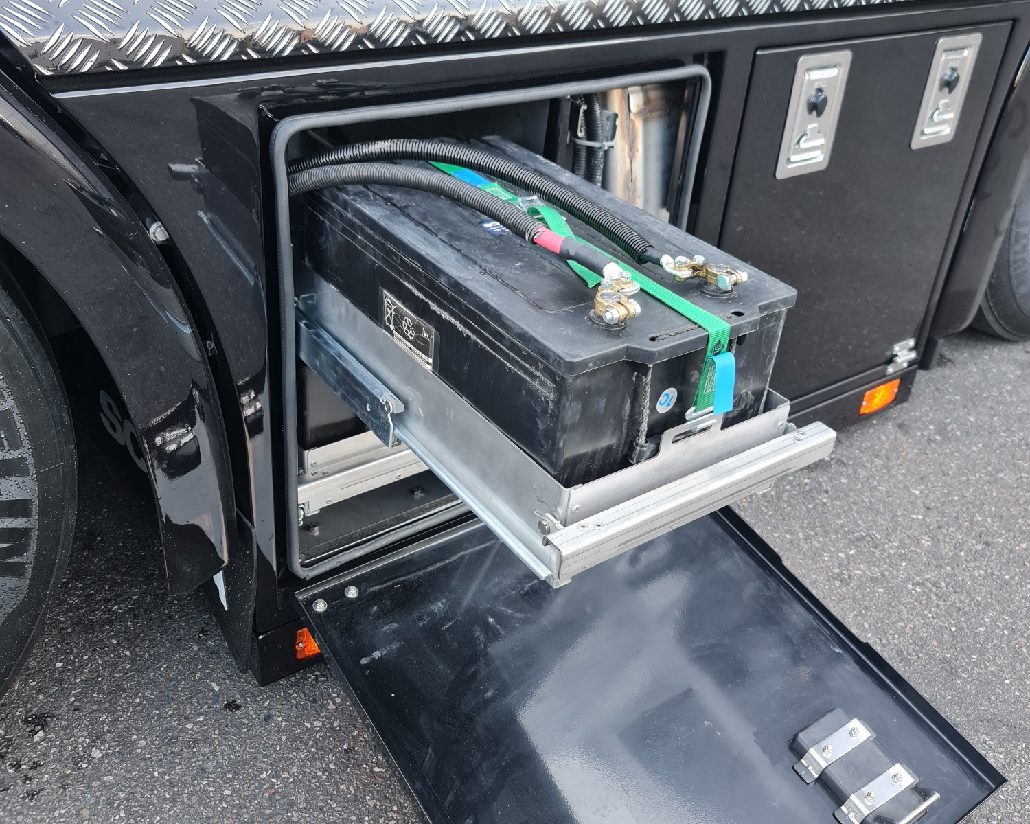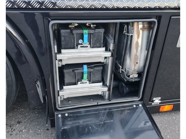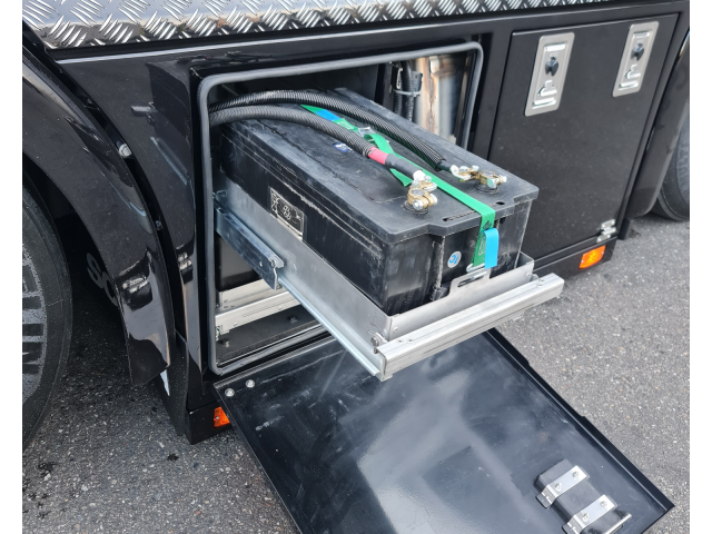 - Rechts kist met accus, deze zijn geplaatst in een schuiflade