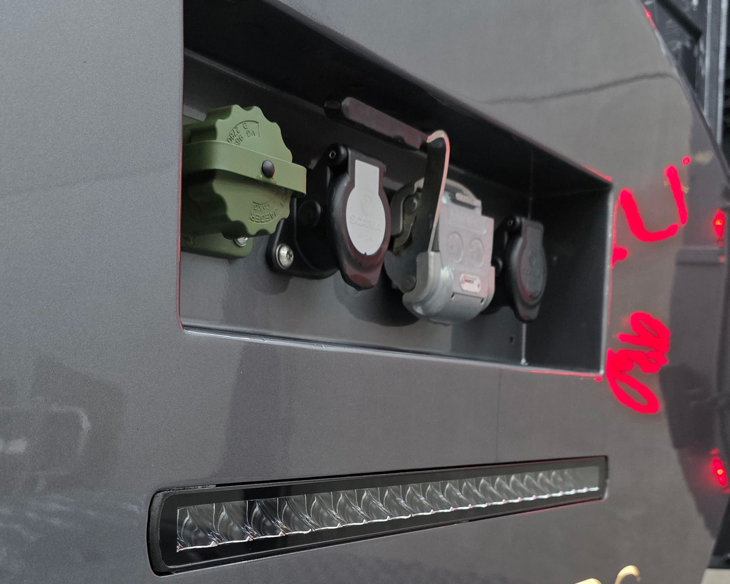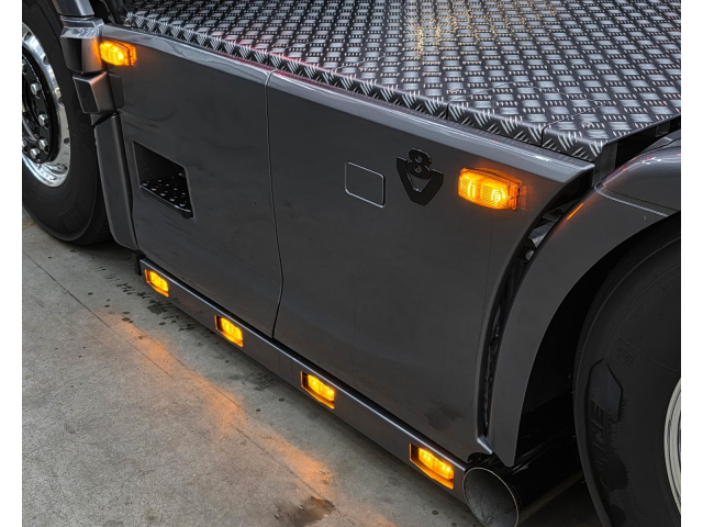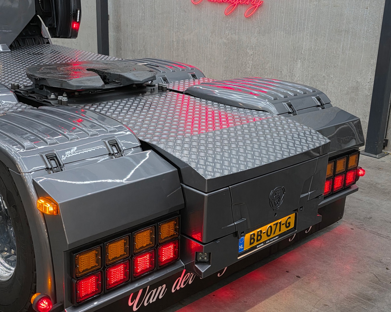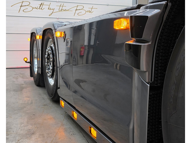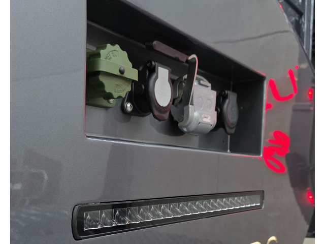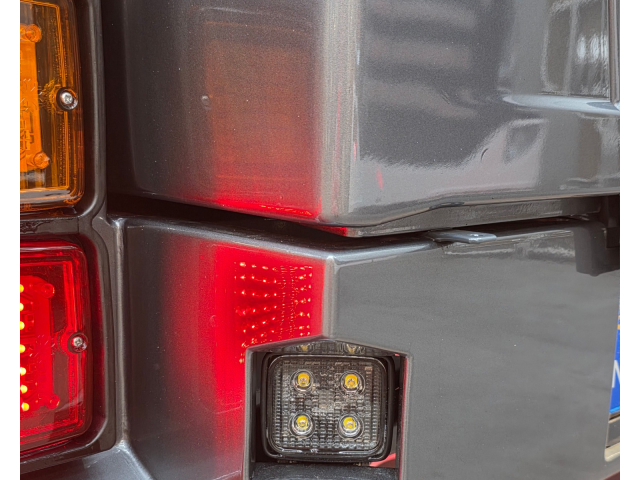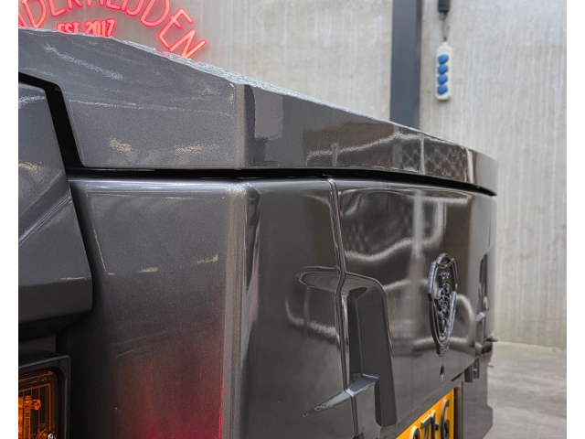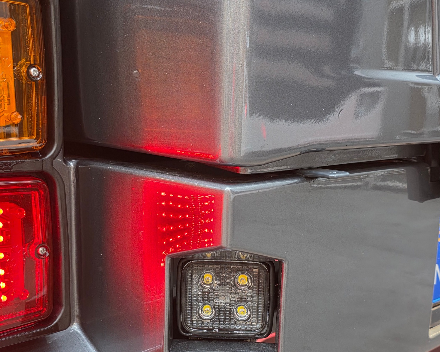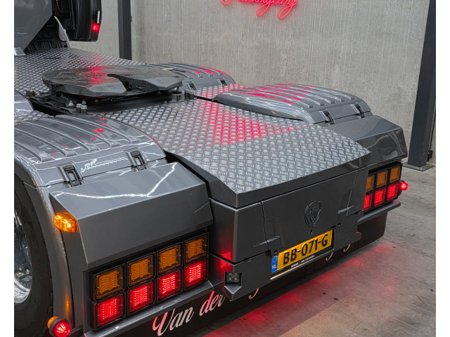 Achterbumper met ledlampen, spatlap verlichting en schuine werklampen onder de accubak