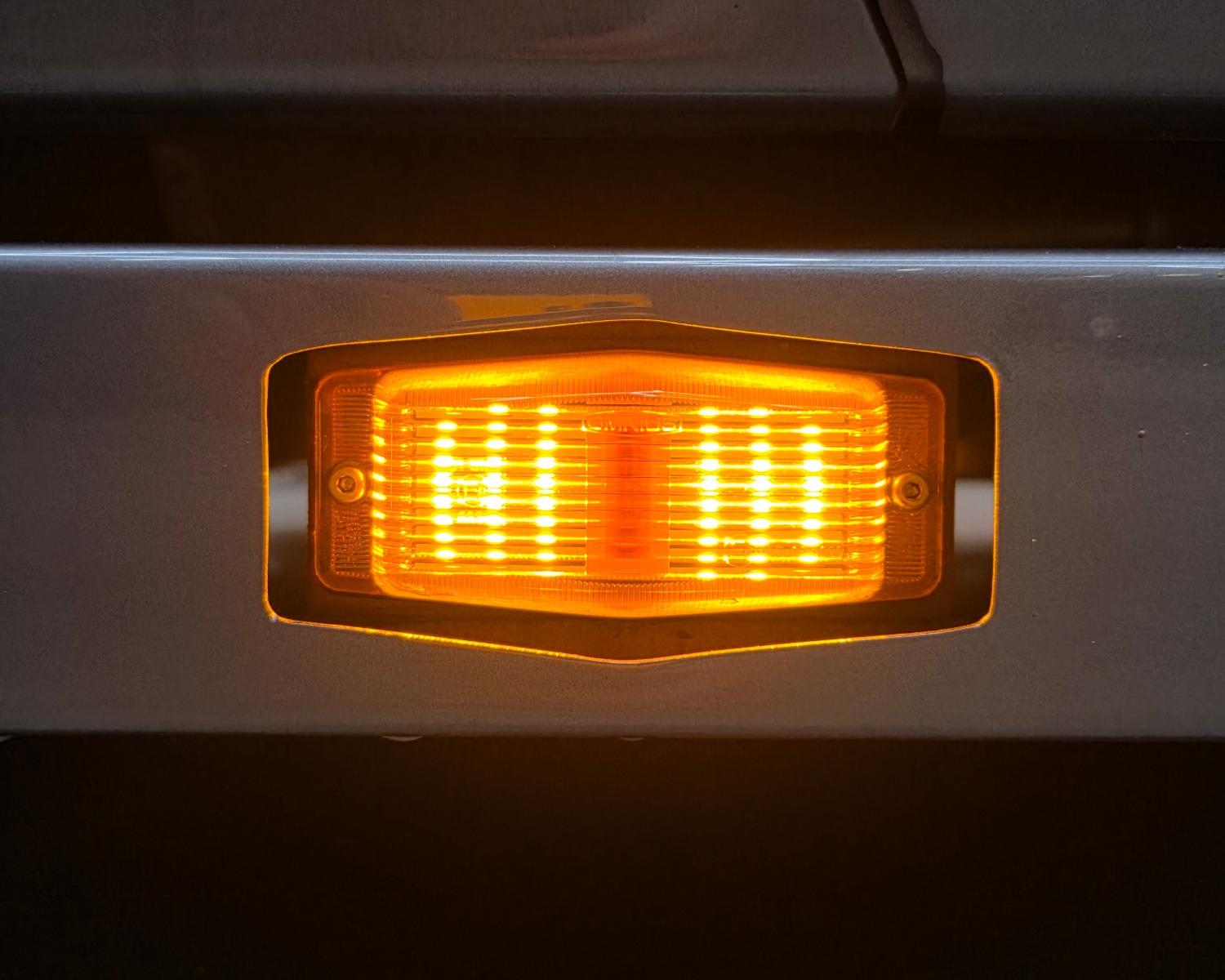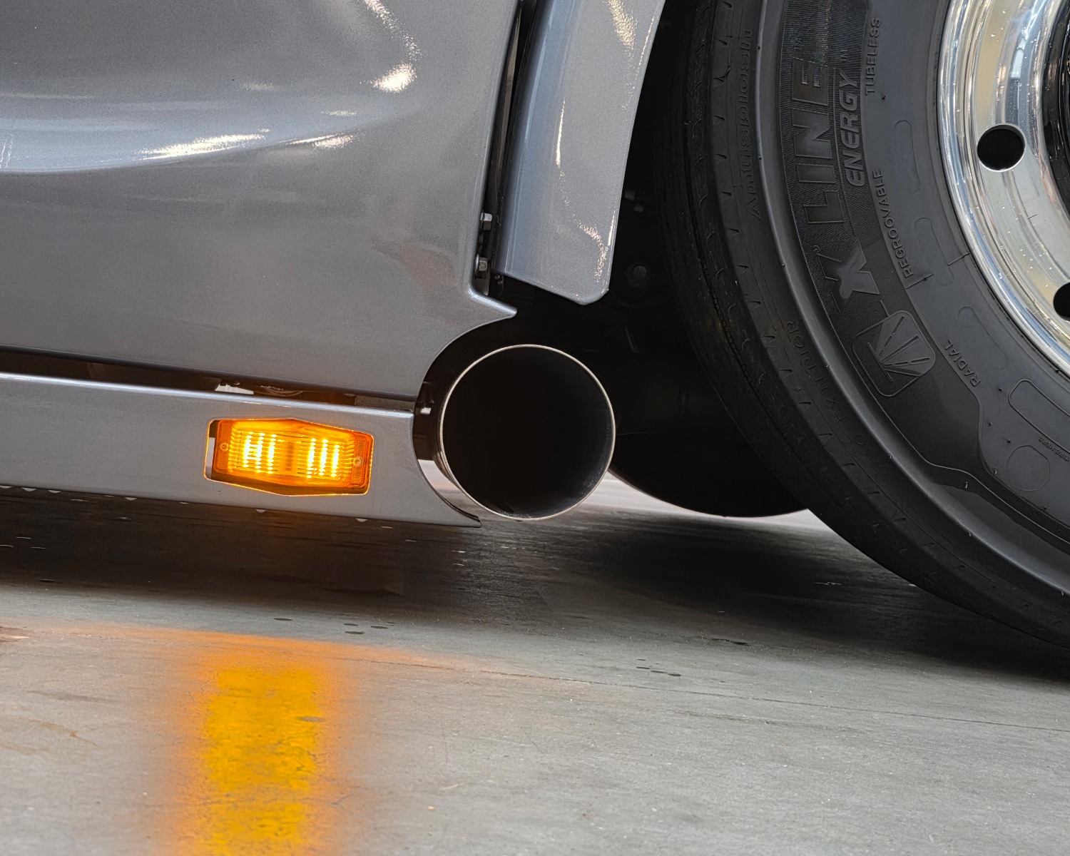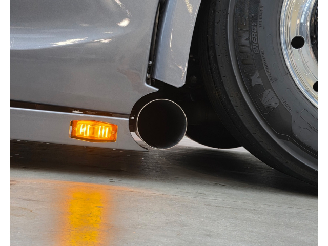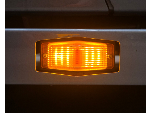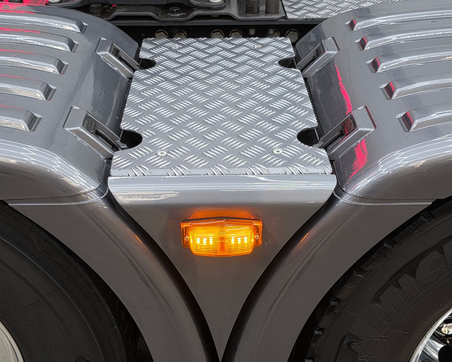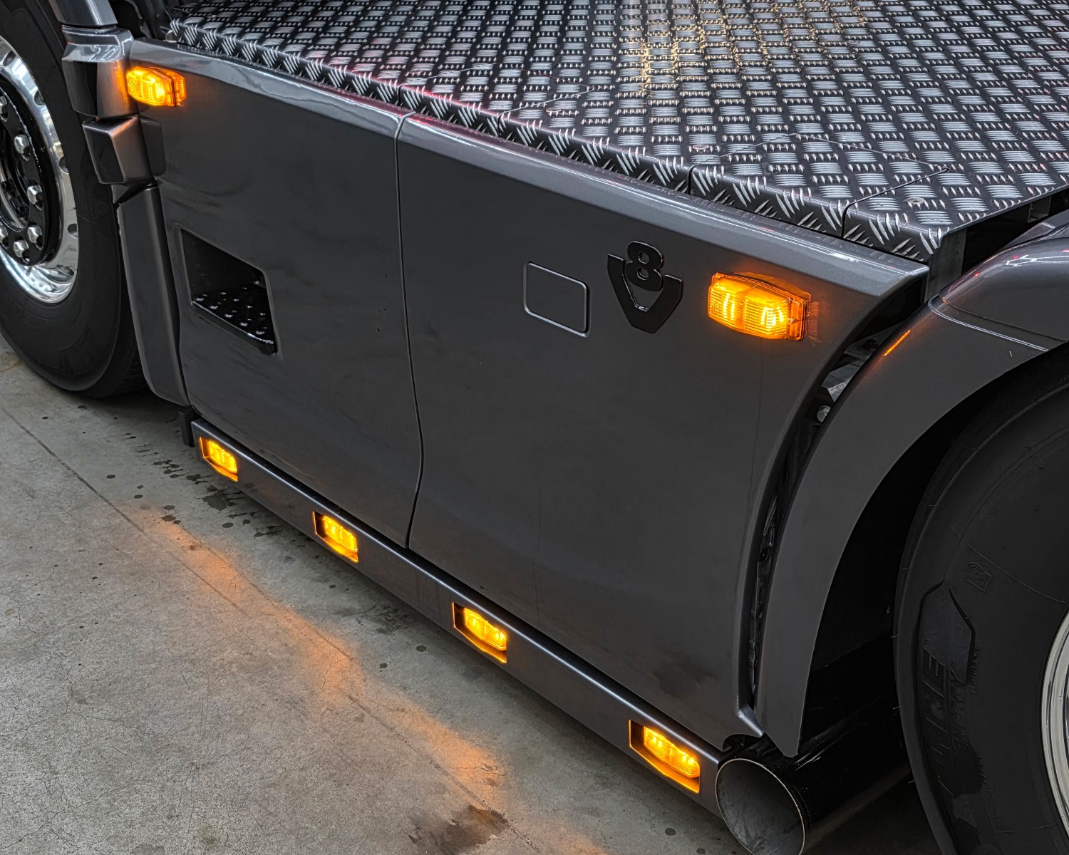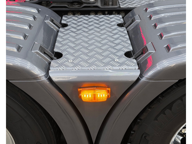 Achterbumper met ledlampen, spatlap verlichting en schuine werklampen onder de accubak