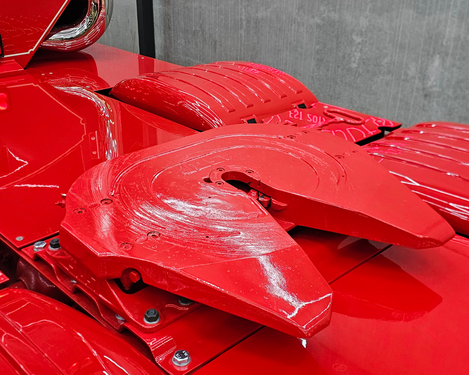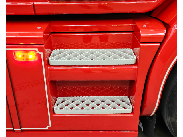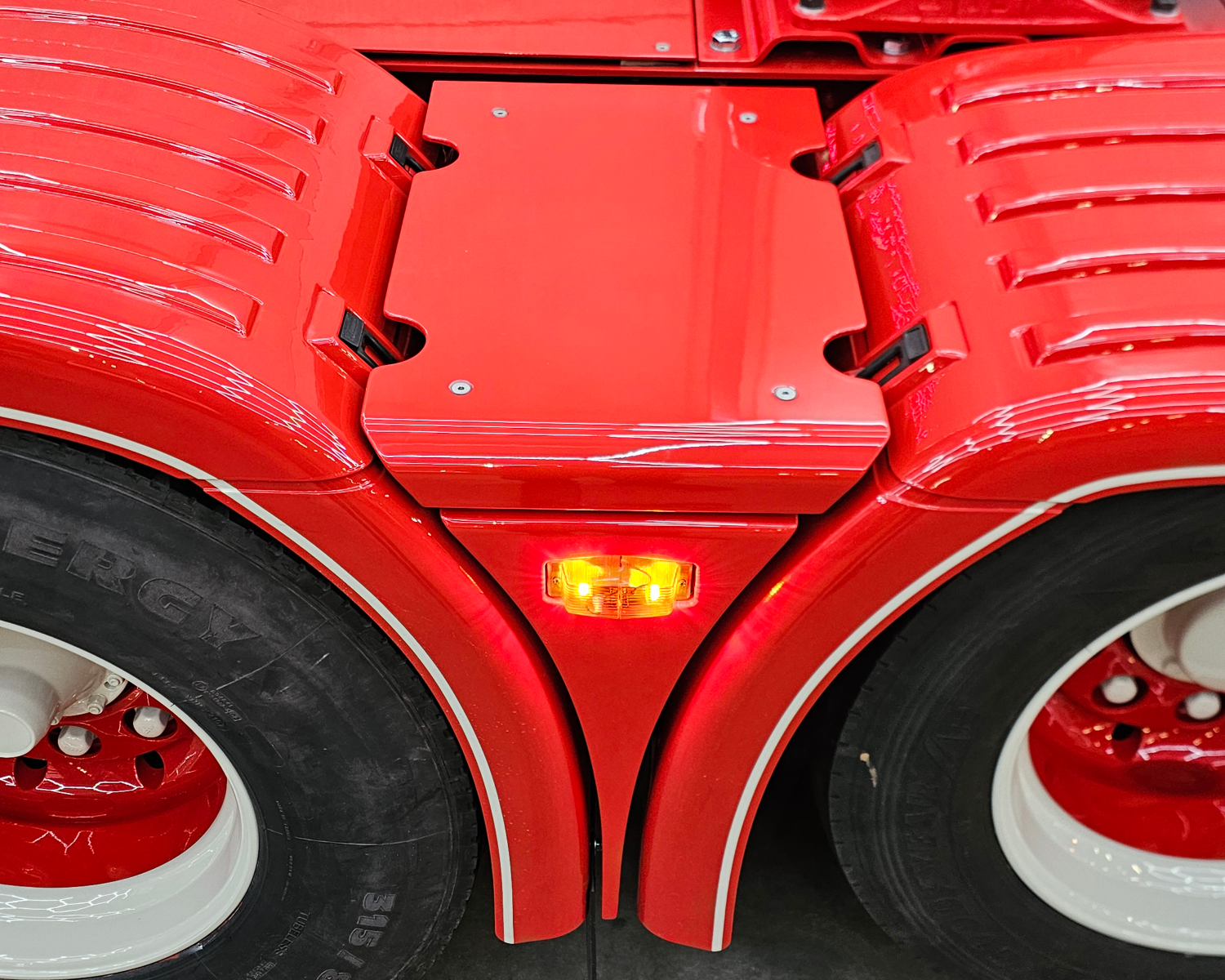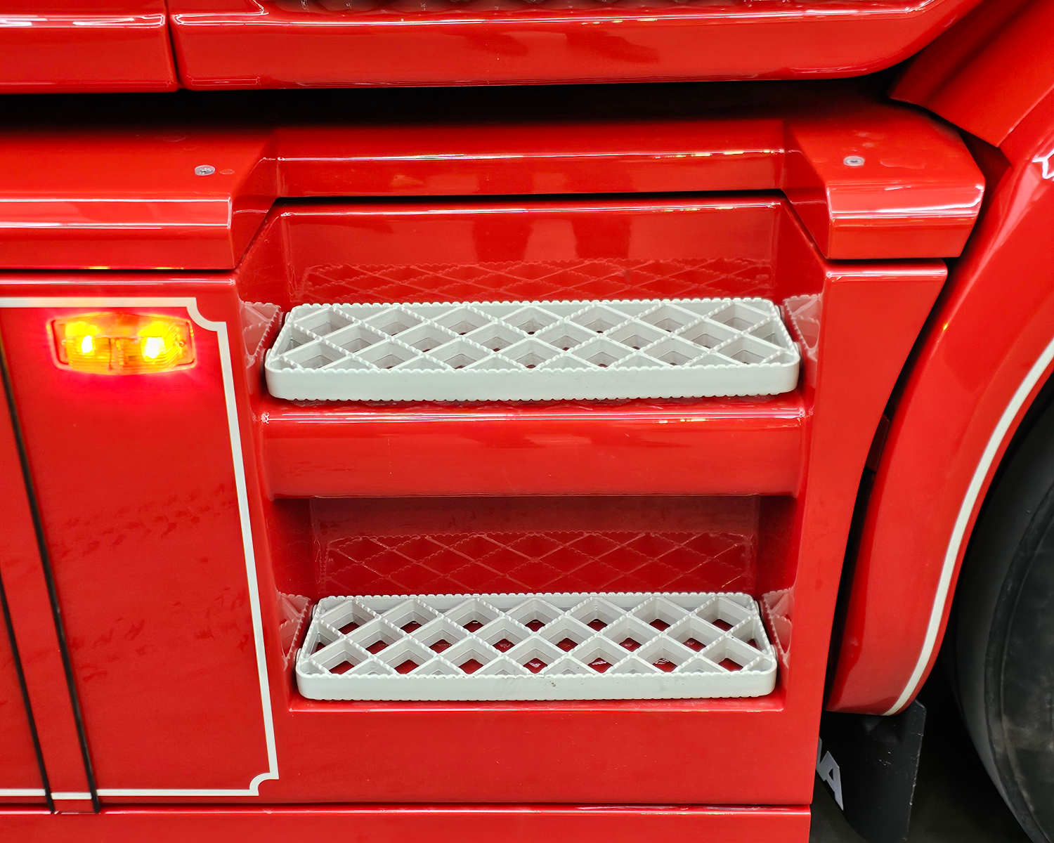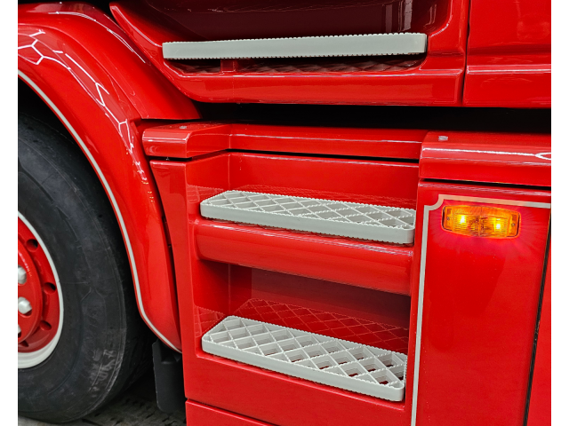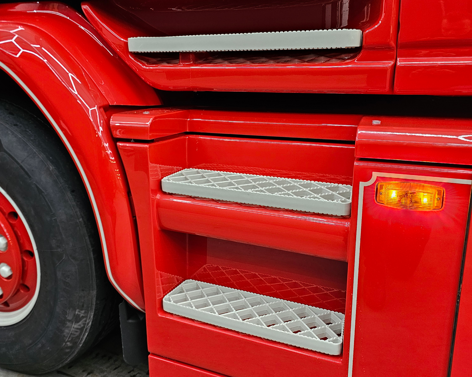Sideskirts met tankbanden en verdiepte dubbelbranders, ook hebben we aan de voorkant de instappen er netjes in verwerkt.