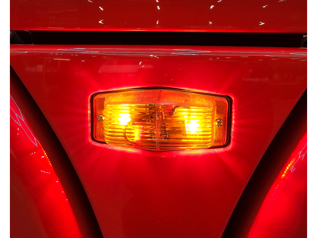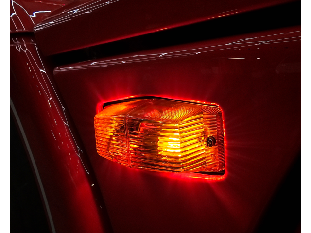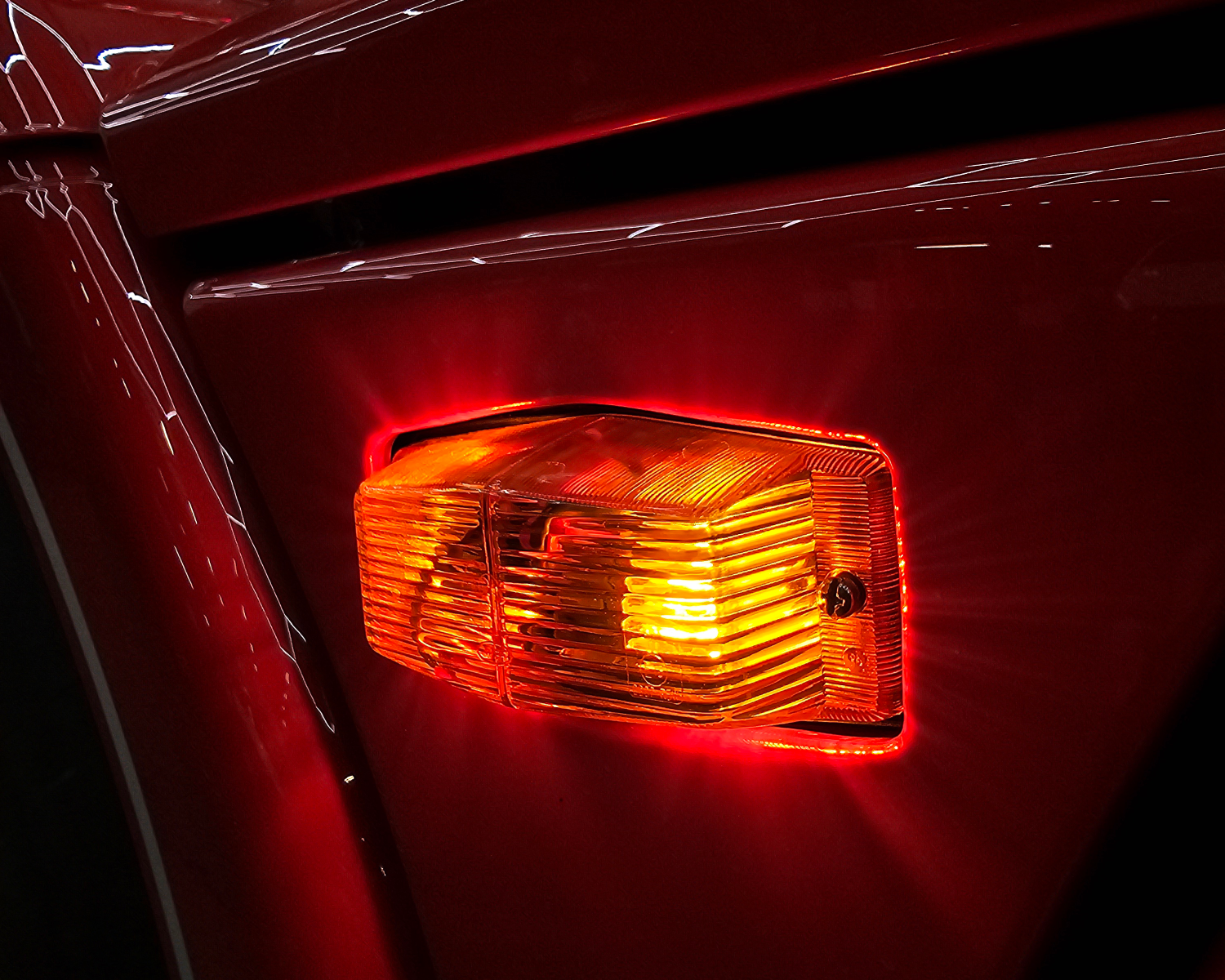 Rode stroboscoop in de koplampen met bolletjes stadslicht erbij, ook in de verstralers en mistlampen